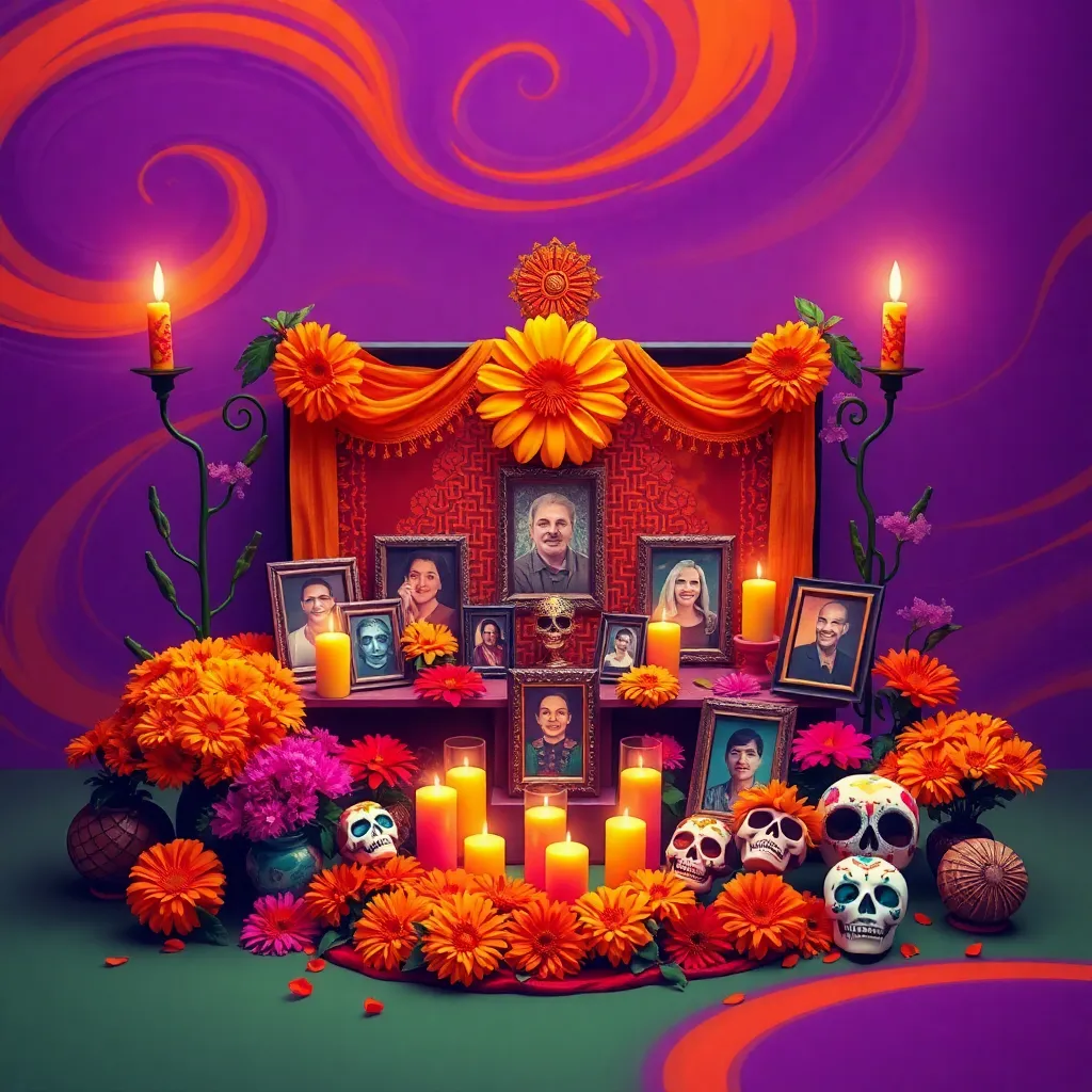 Create an AI image that captures the vibrant spirit of Dia de los Muertos. Depict a colorful altar adorned with marigolds, candles, and photographs of loved ones. Incorporate traditional Mexican decorations, such as papel picado and sugar skulls, amidst a backdrop of swirling purple and orange hues.