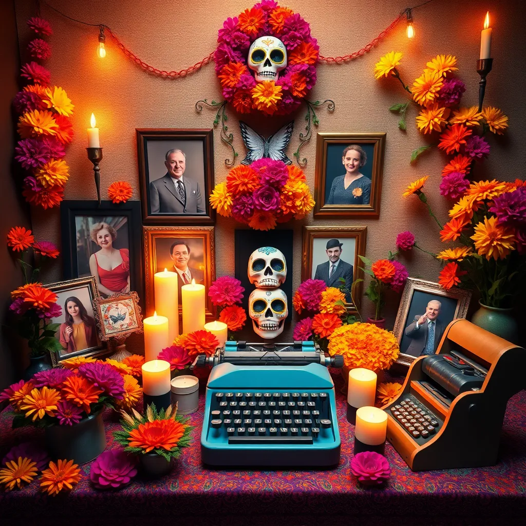 Create an AI-generated image of a vibrant altar dedicated to loved ones who have passed, adorned with colorful marigolds, candles, photographs, and traditional Day of the Dead offerings. Incorporate a mix of modern and traditional elements, such as a sugar skull or a vintage typewriter, to pay homage to the deceased.