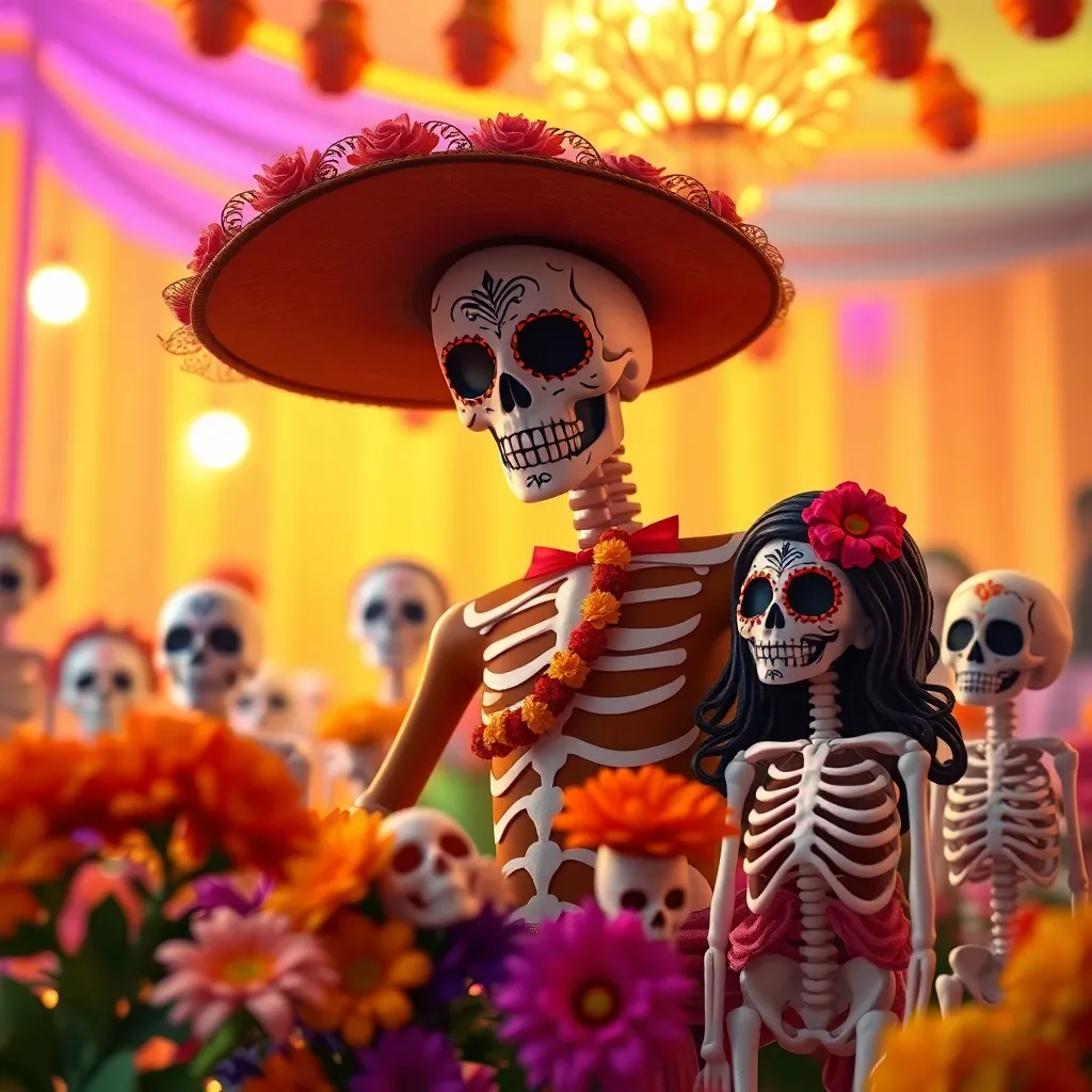 Create an AI-generated image depicting a vibrant Dia de los Muertos celebration. Incorporate traditional elements such as marigolds, sugar skulls, and papier-mâché skeletons. Incorporate a colorful backdrop with a warm glow, and include a mix of living and deceased characters coming together to honor their loved ones.