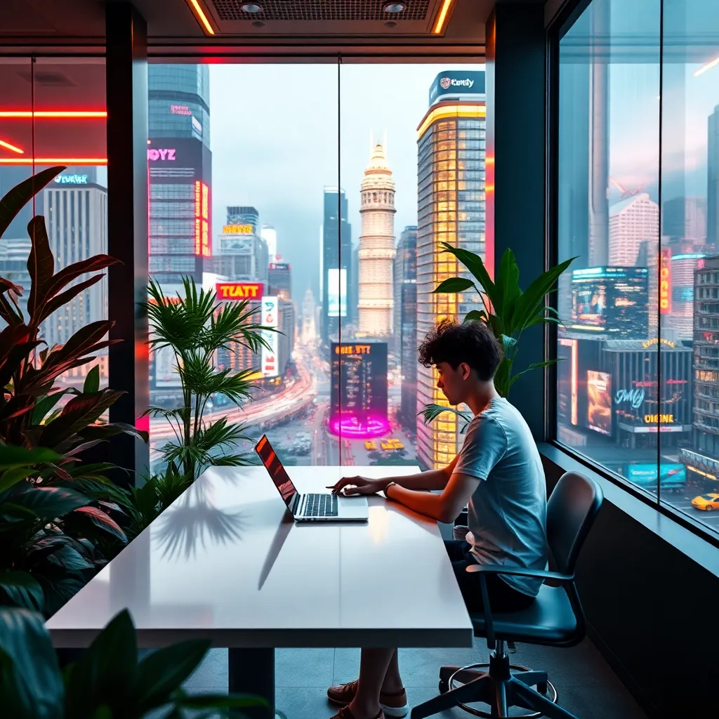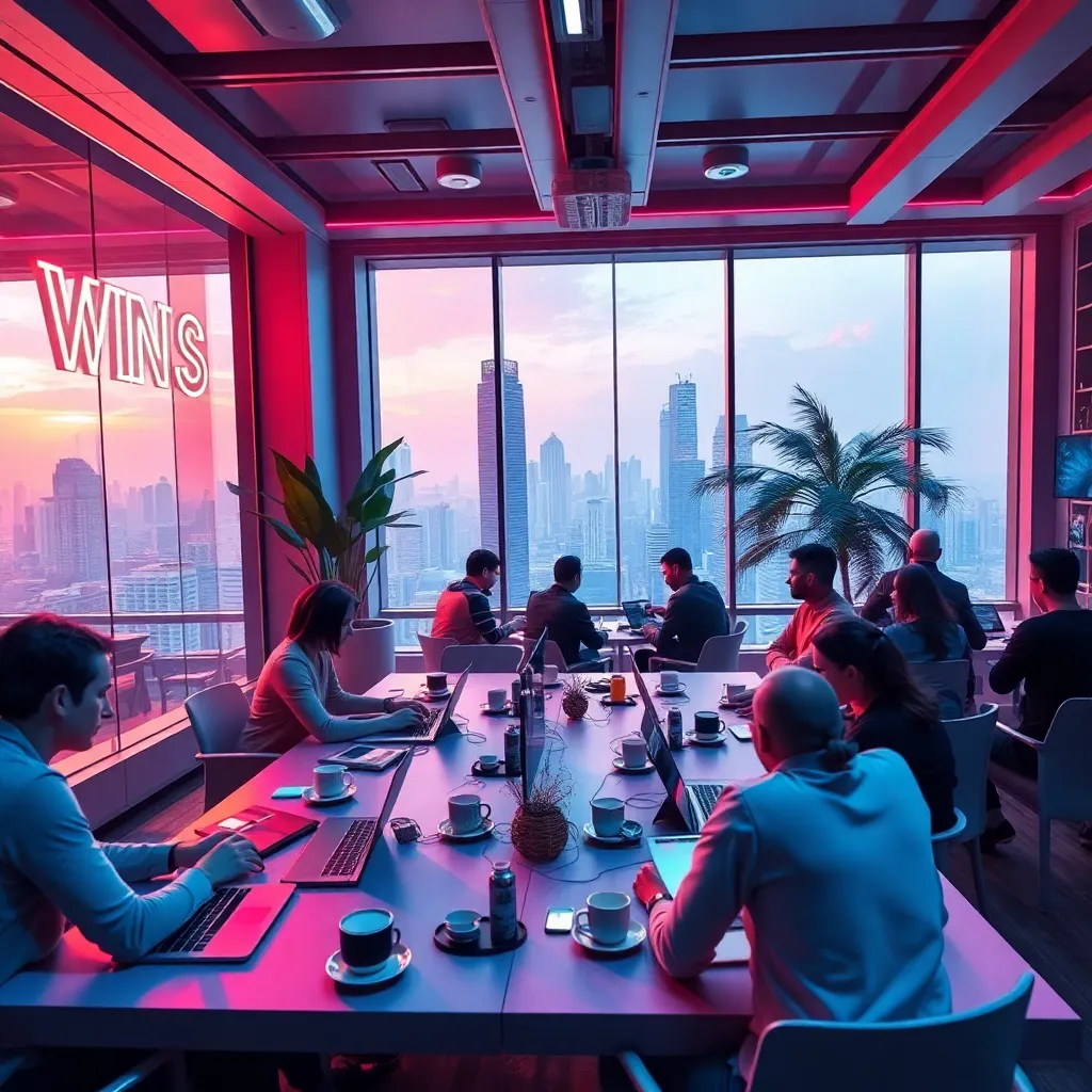 Imagine a futuristic co-working space in a vibrant city, where digital nomads from around the world gather to collaborate and innovate. Capture the bustling atmosphere, with laptops and coffee cups scattered about, and a stunning cityscape view through the floor-to-ceiling windows. Incorporate neon lights and a hint of tropical vibes.