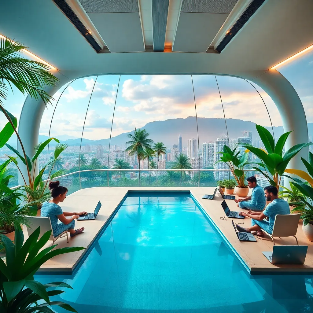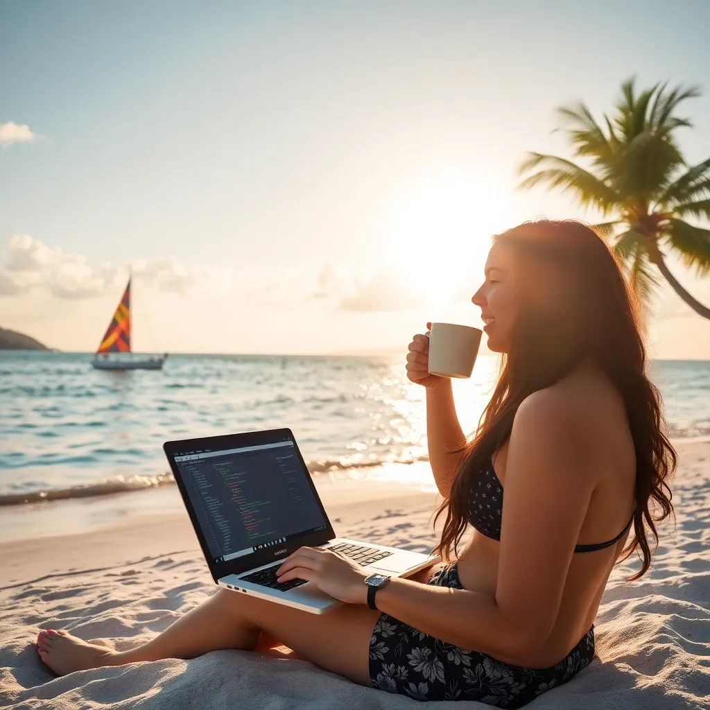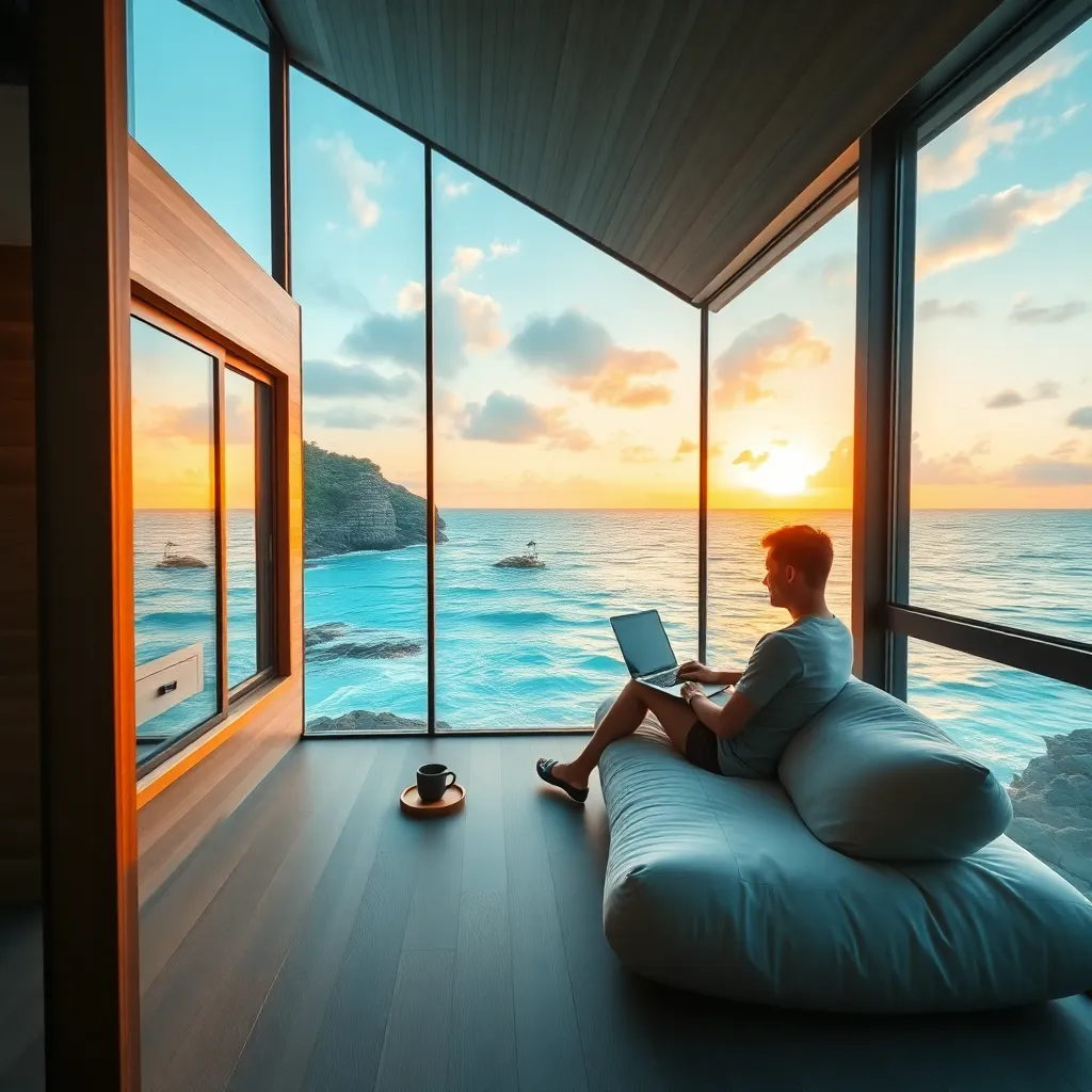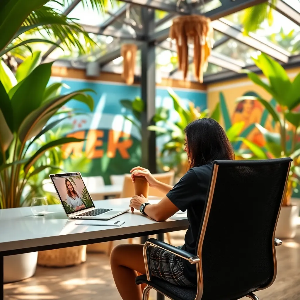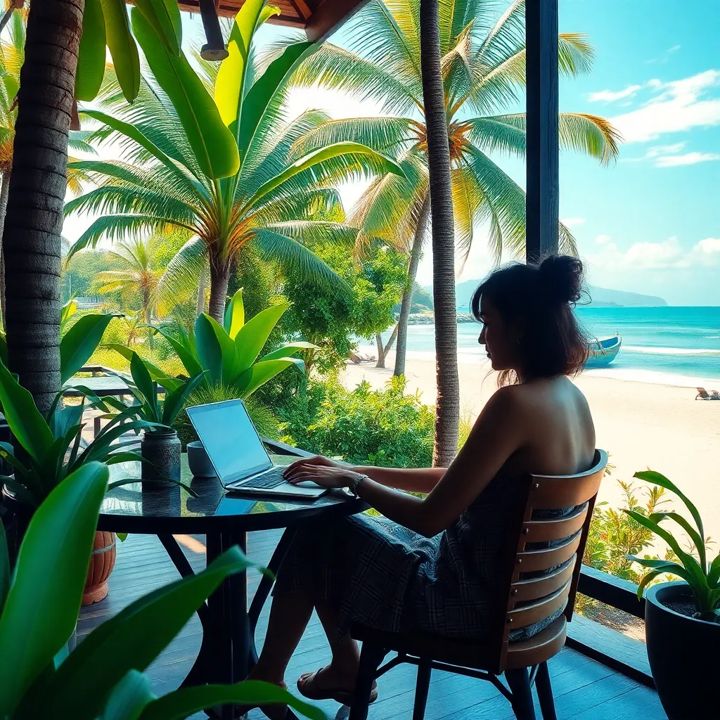 Imagine a futuristic coworking space on a tropical island, with a stunning beachside view. A digital nomad sits at a sleek desk, surrounded by lush greenery, sipping a coffee and typing away on their laptop. The sun is shining, and a gentle breeze carries the sound of waves crashing in the distance.