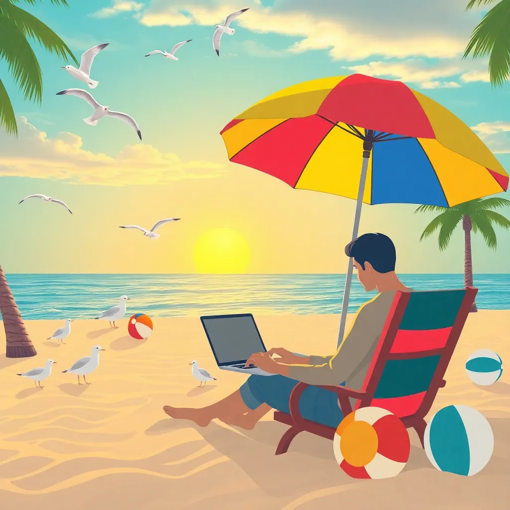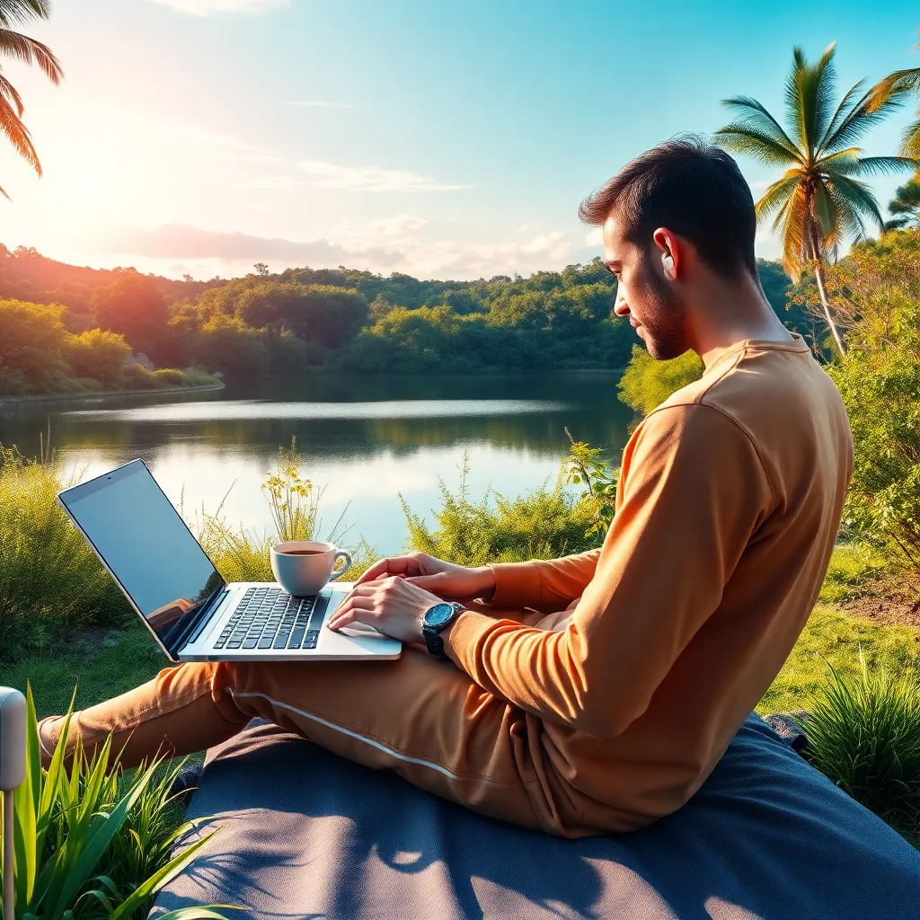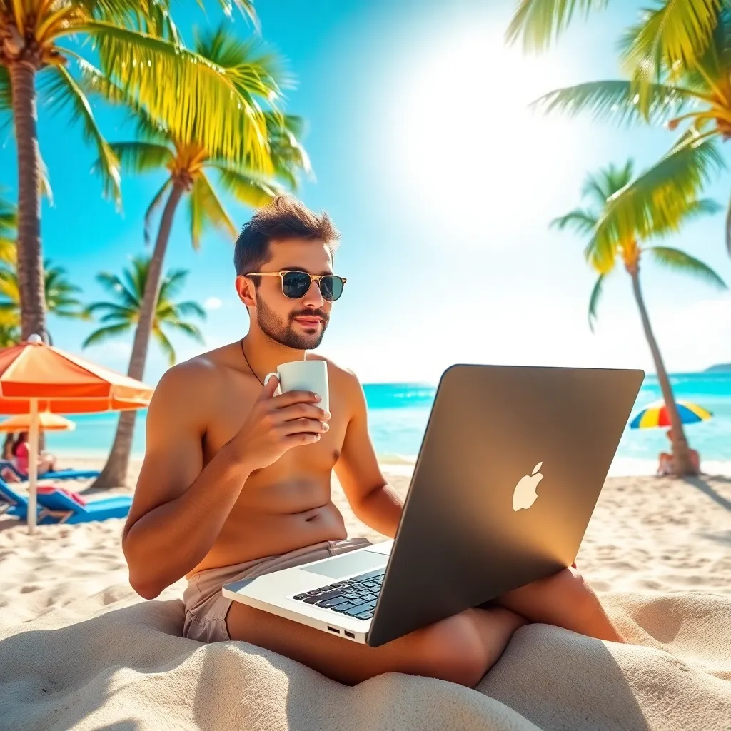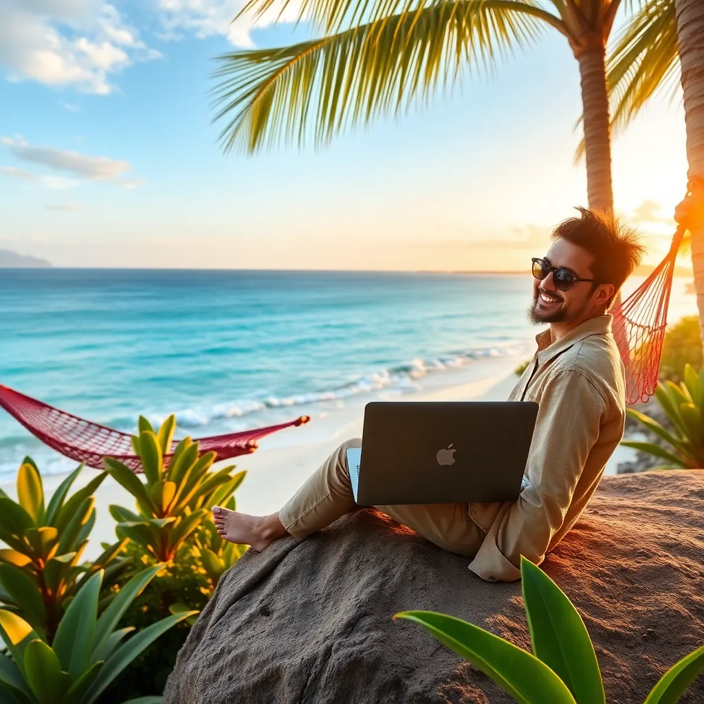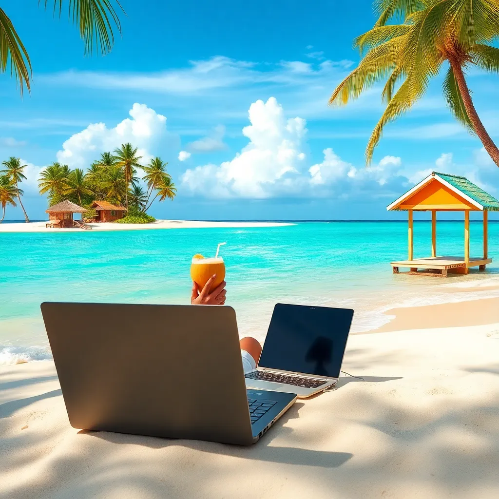 Imagine a futuristic coworking space on a tropical island, with a stunning beachside view. A digital nomad sits at a sleek desk, surrounded by lush greenery, sipping a coffee and typing away on their laptop. The sun is shining, and a gentle breeze carries the sound of waves crashing in the distance.