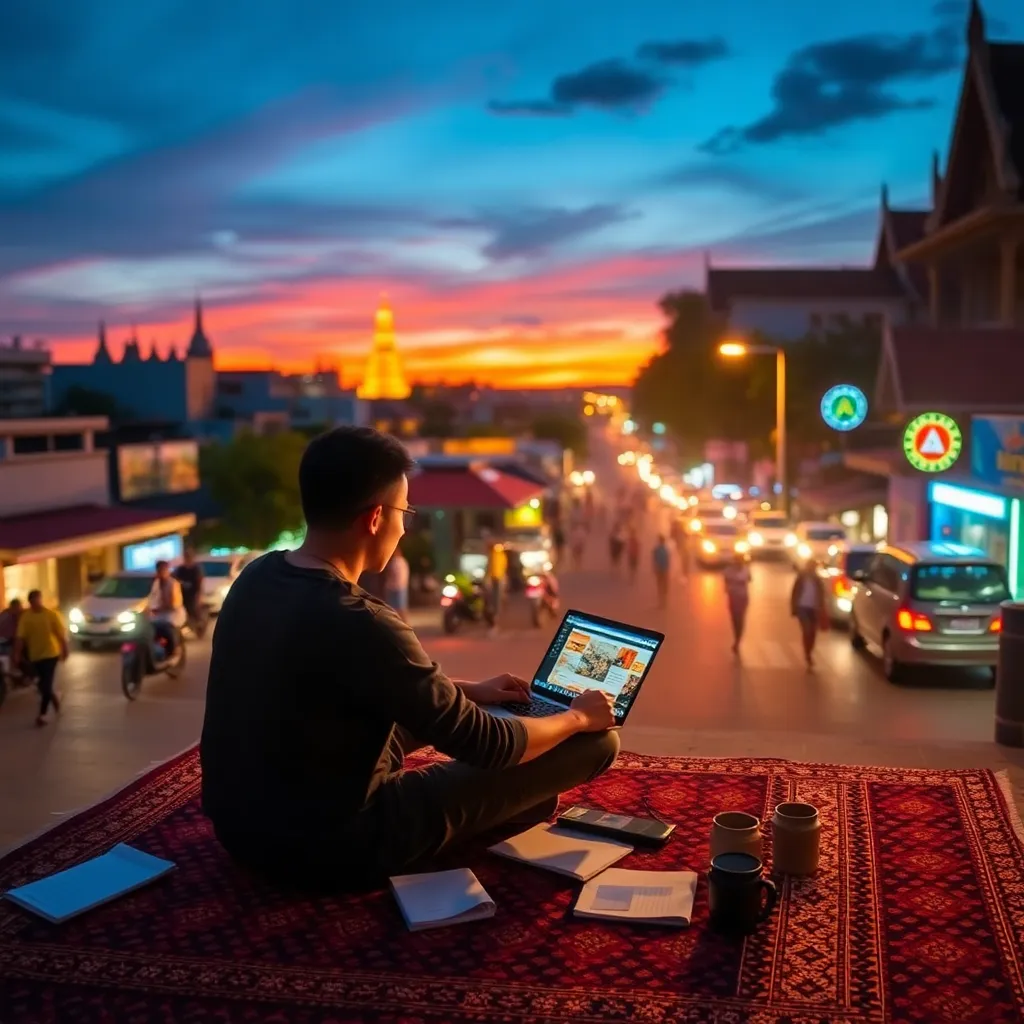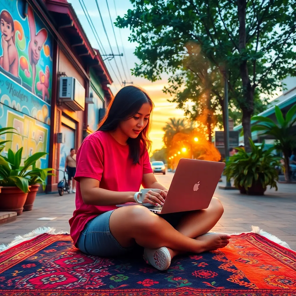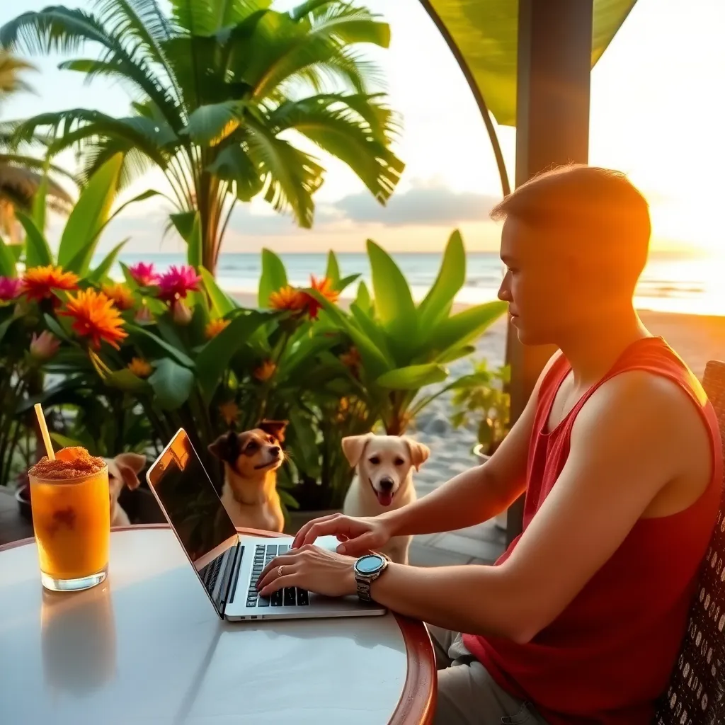 Imagine a serene beachside café in Bali, Indonesia, where a digital nomad is working on their laptop amidst lush greenery and vibrant tropical flowers. The sun is setting, casting a warm golden light on the scene. The digital nomad is surrounded by a few curious local dogs and a refreshing coconut drink.