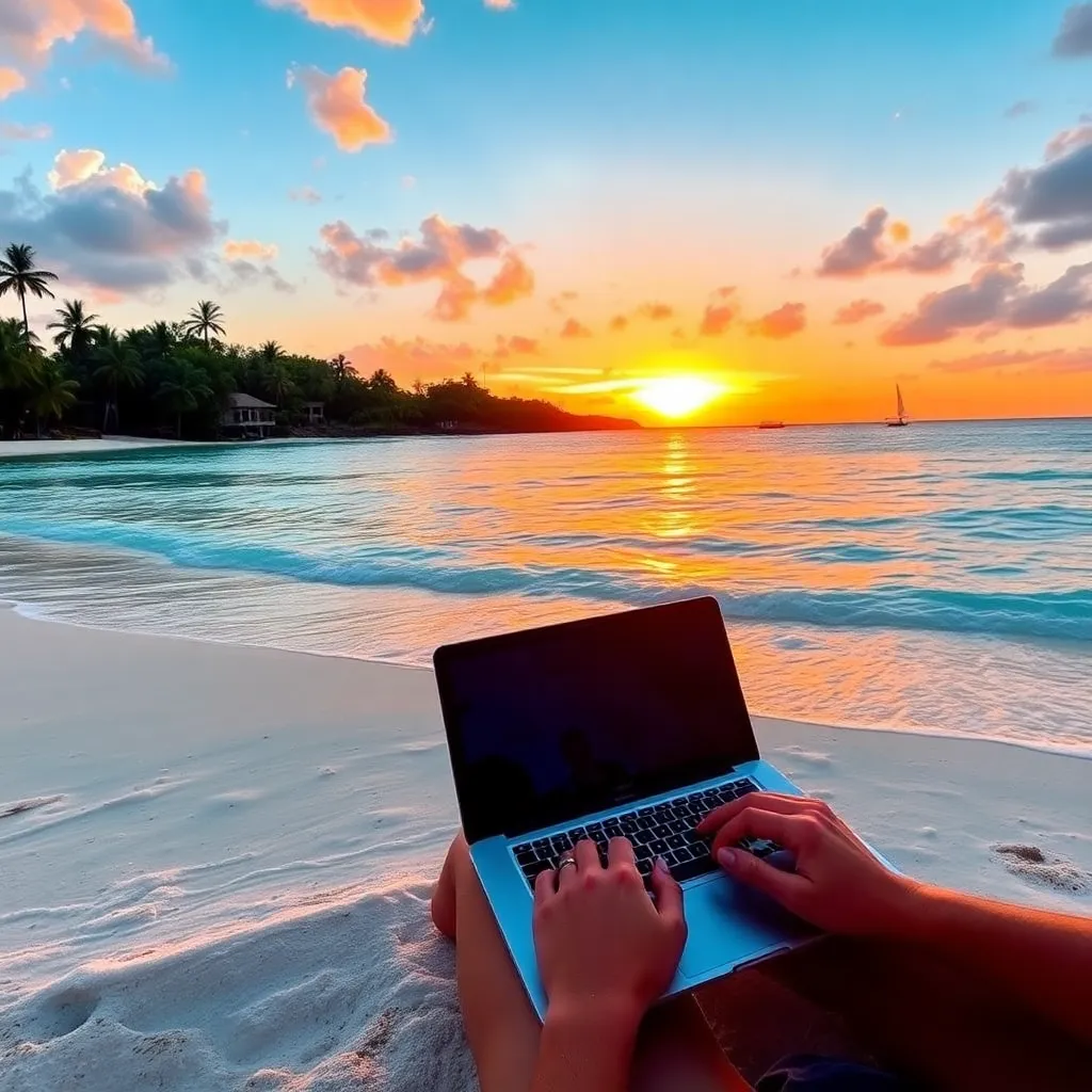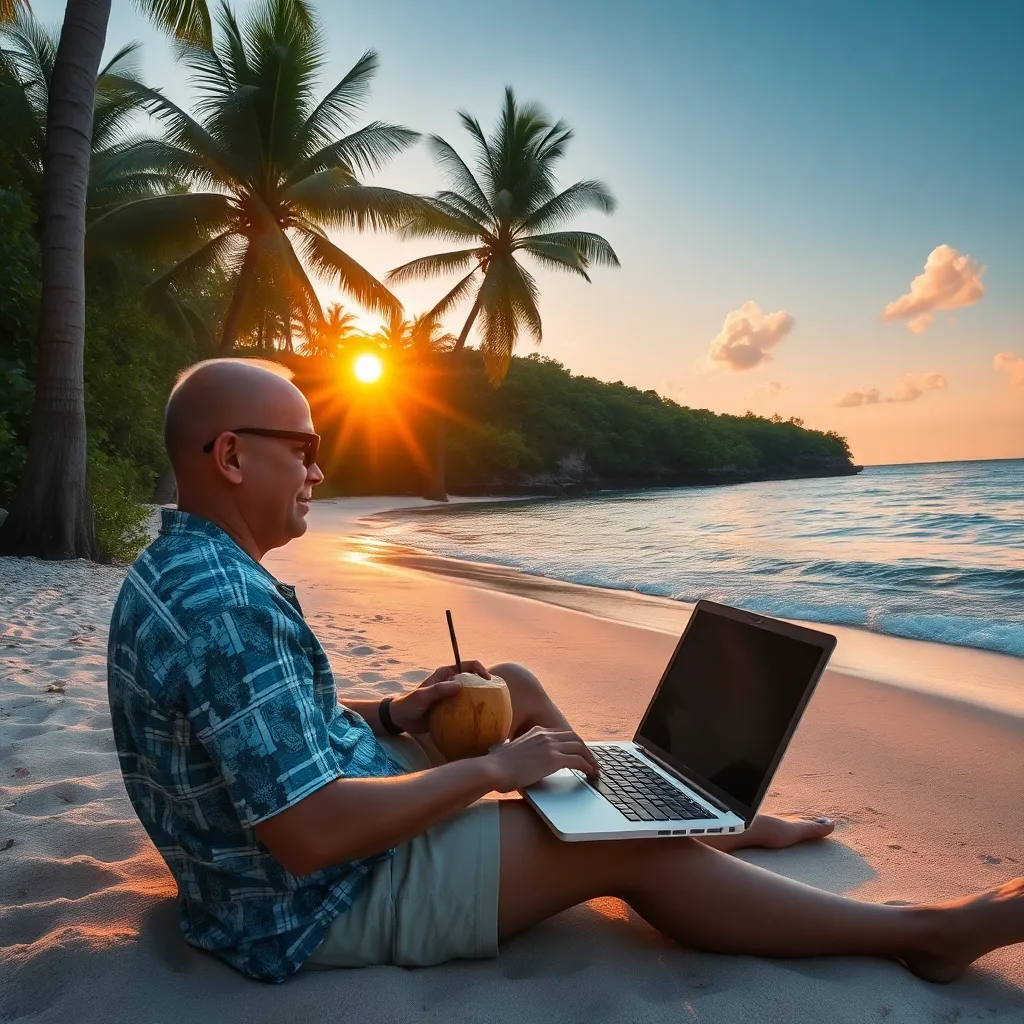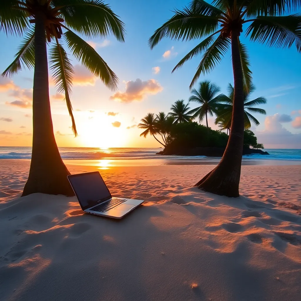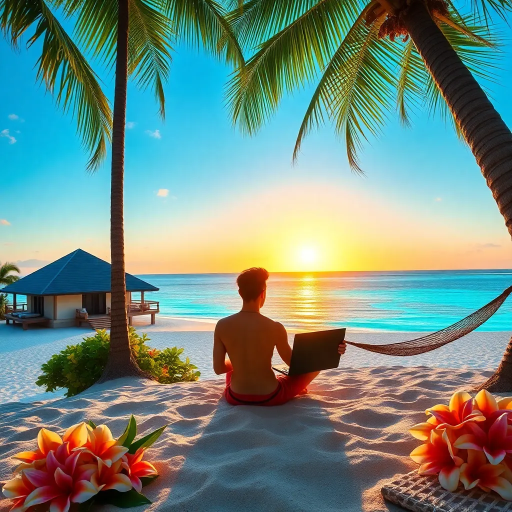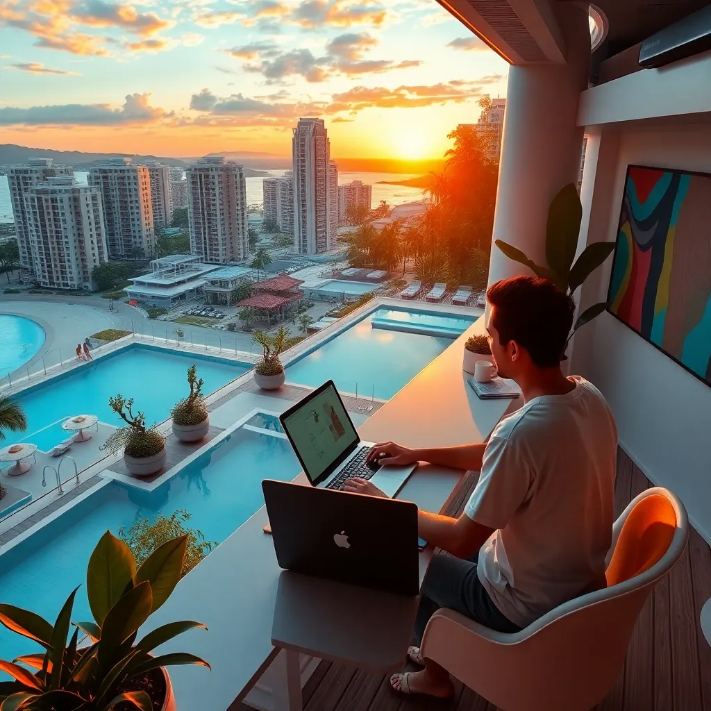Imagine a futuristic co-working space on a tropical island, surrounded by swaying palm trees and a crystal-clear ocean. A digital nomad sits at a sleek desk, laptop open, with a refreshing cocktail in hand. The sun is setting, casting a warm glow over the scene. Generate an image that captures this idyllic work-life balance.