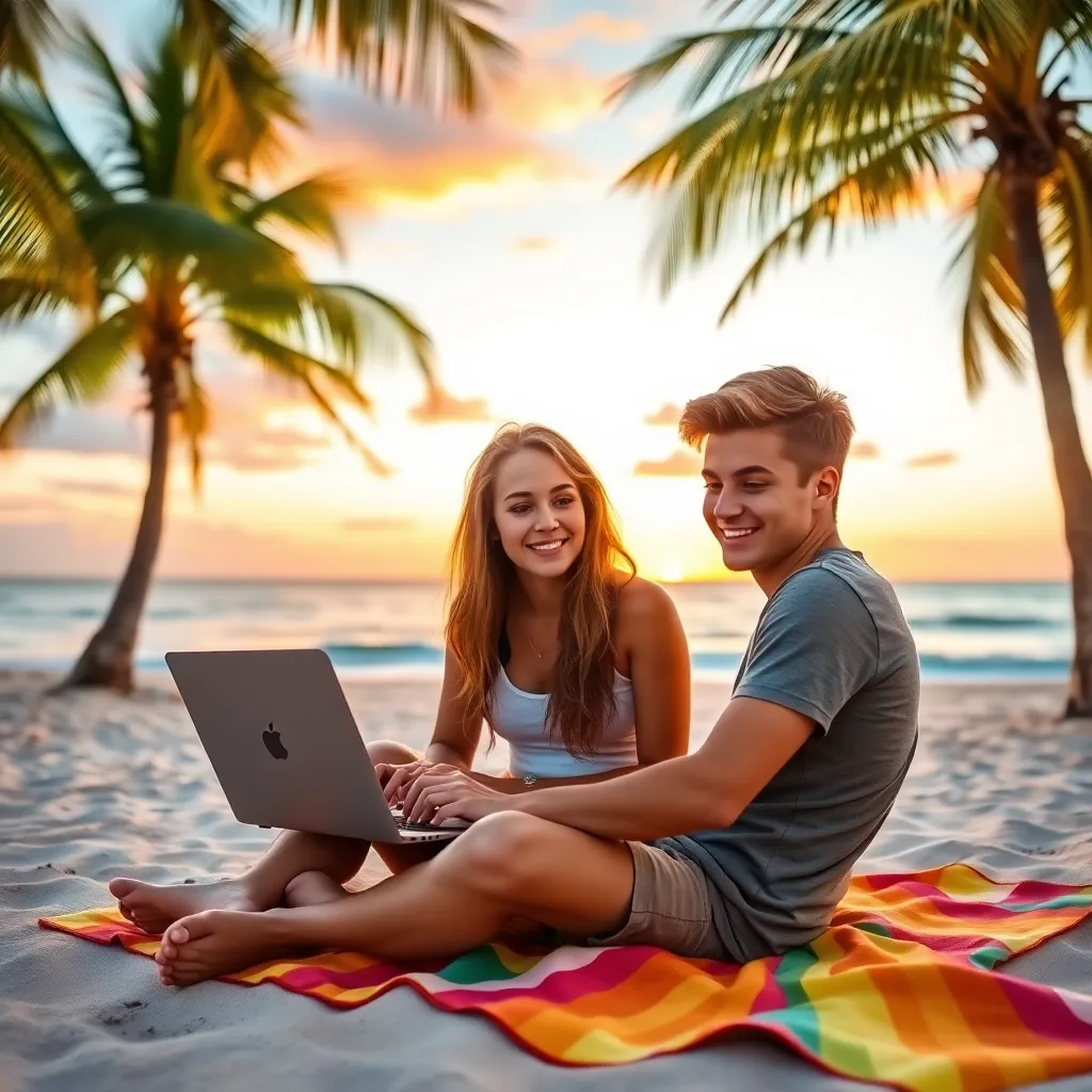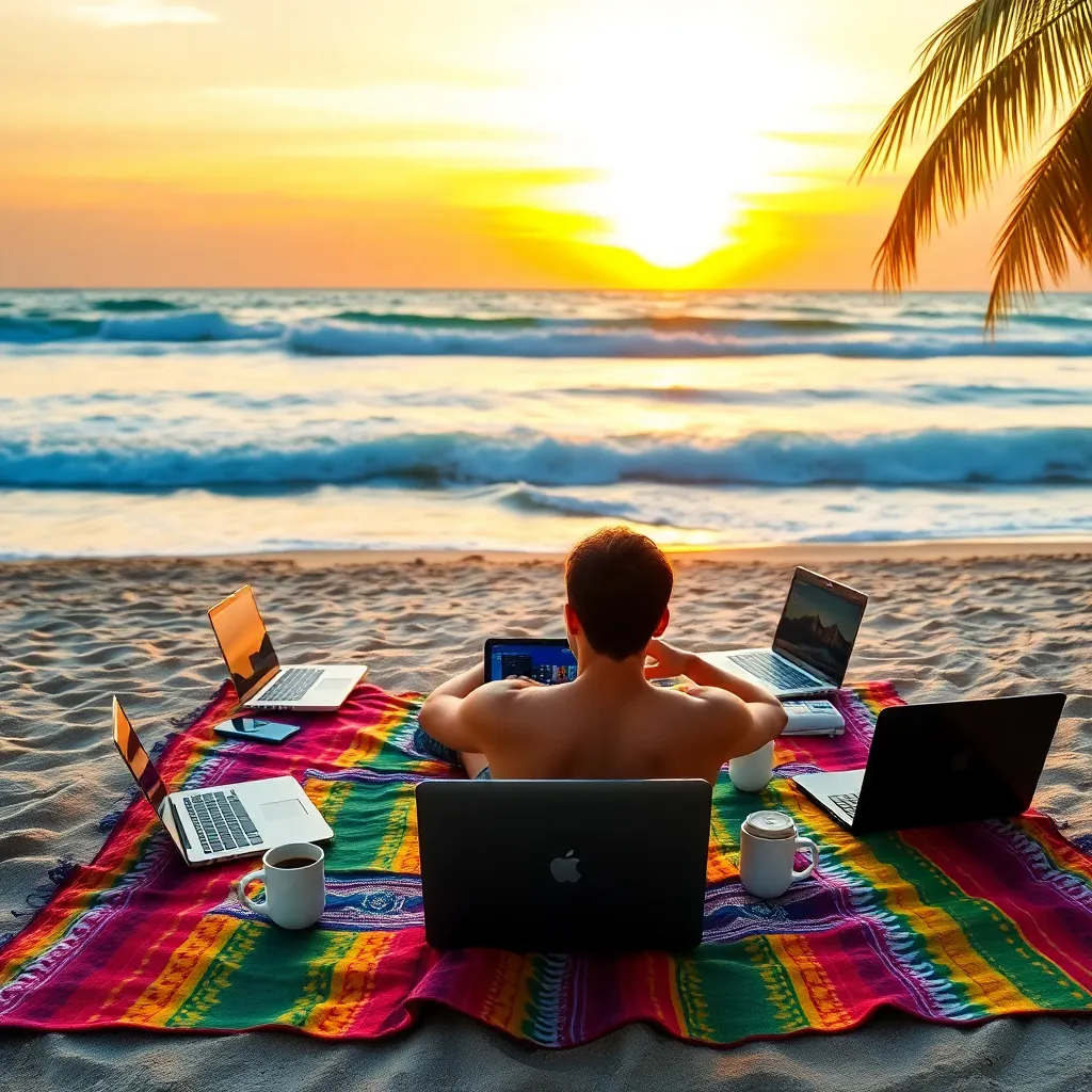 Imagine a serene beachside workspace, where palm trees sway in the breeze and the sound of waves gently crashes against the shore. A digital nomad sits comfortably, laptop open, sipping a refreshing coconut drink. The warm sun casts a golden glow, illuminating the vibrant colors of the tropical paradise.