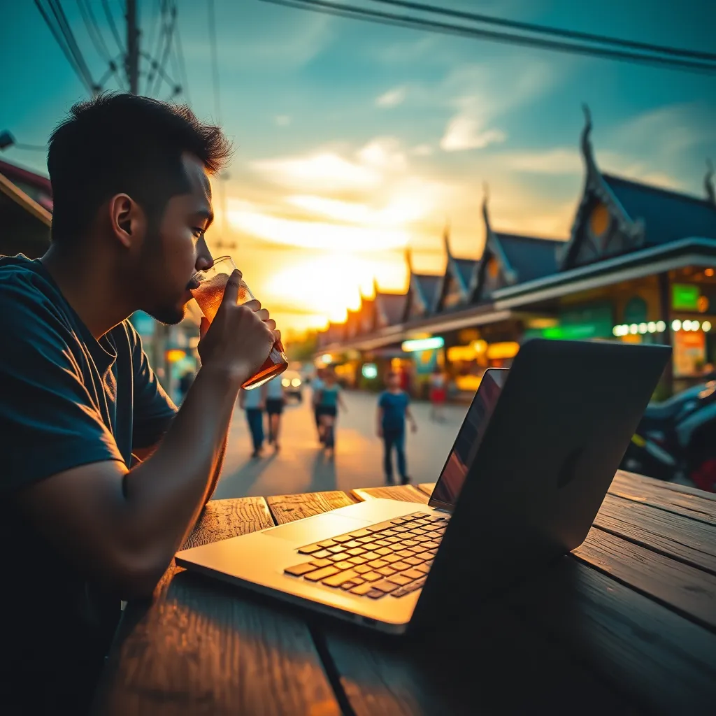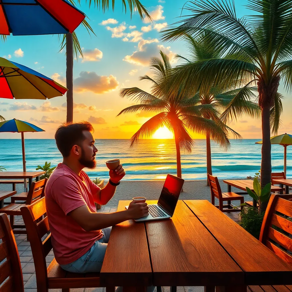 Imagine a vibrant beachside cafe in Bali, Indonesia. A laptop-adorned digital nomad sits at a wooden table, sipping a coconut coffee as the sun sets over the turquoise ocean. The cafe's colorful umbrellas and palm trees sway gently in the breeze. Create an AI-generated image that captures this tropical haven.