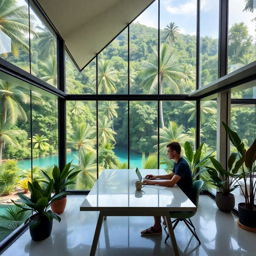 Imagine a futuristic coworking space in a tropical paradise. A sleek, modern building with floor-to-ceiling windows overlooking a lush green forest and a sparkling blue lake. A digital nomad sits at a minimalist desk, surrounded by lush plants, with a laptop and a cup of coffee, lost in coding flow.
