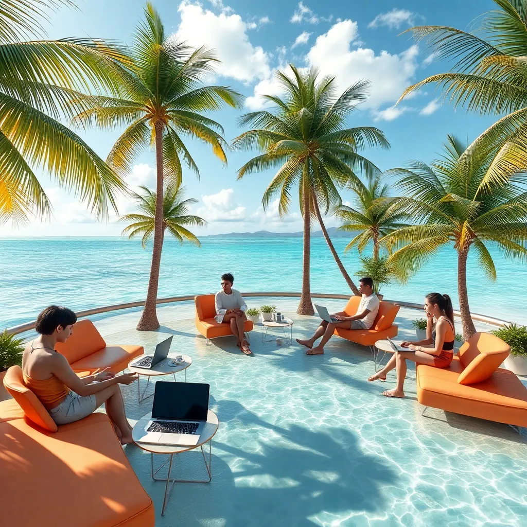 Imagine a futuristic coworking space on a tropical island, where digital nomads gather to work amidst swaying palm trees and crystal-clear waters. Create an AI-generated image that captures the vibrant atmosphere, with laptops and coffee cups scattered around, and a sense of freedom and adventure radiating from the scene.
