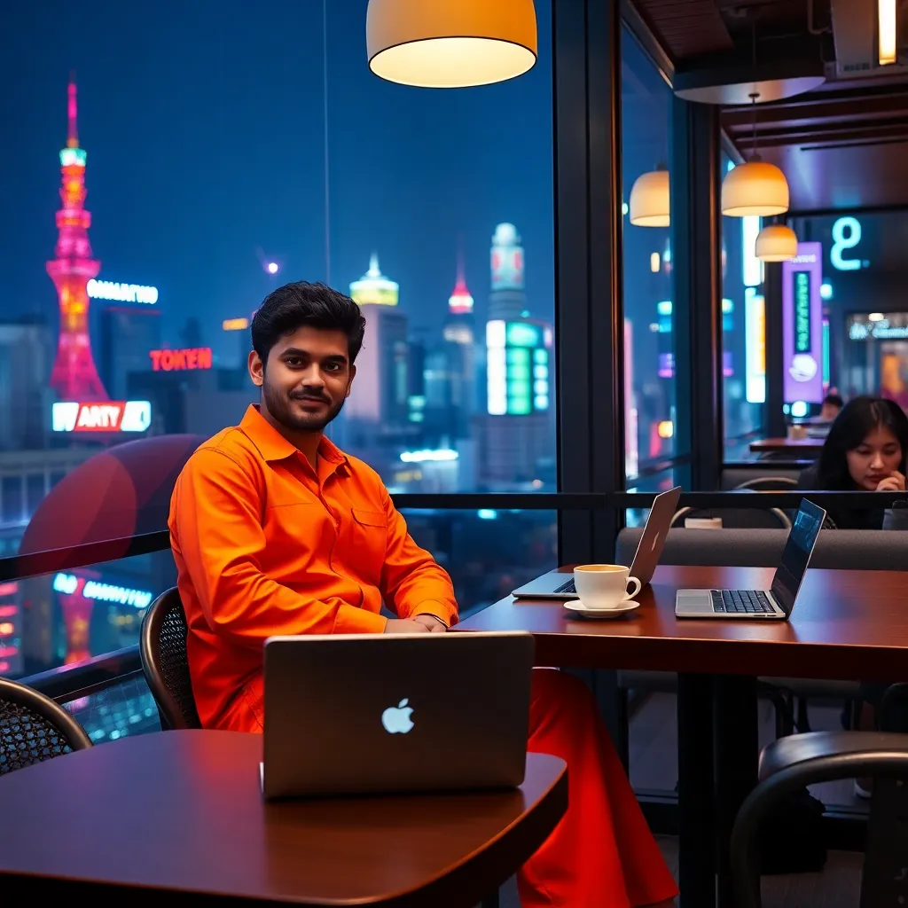 Create an image of a digital nomad sitting at a trendy coffee shop in Tokyo, surrounded by laptops and coffee cups. The nomad is wearing a bright orange jumpsuit and has a relaxed expression, with a cityscape view in the background. Incorporate neon lights and vibrant colors to capture the essence of the city.