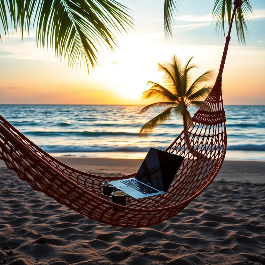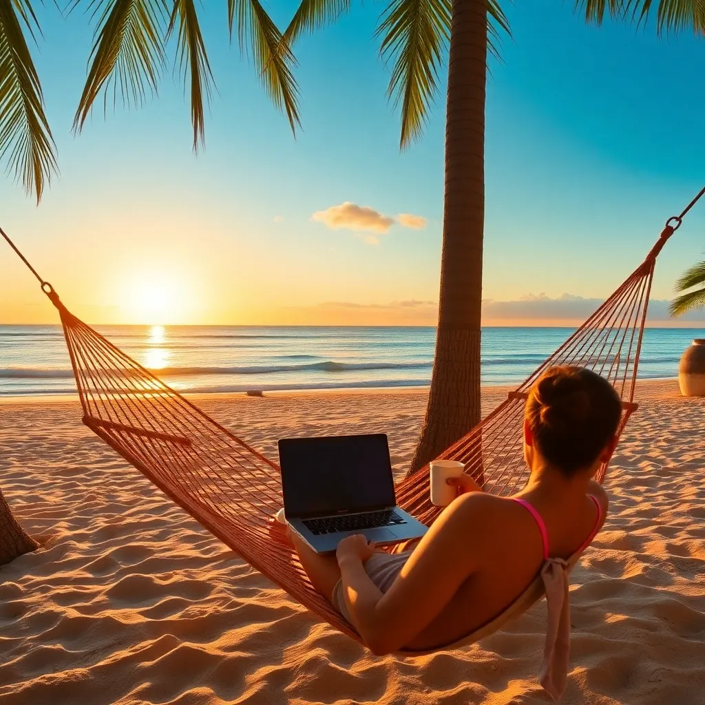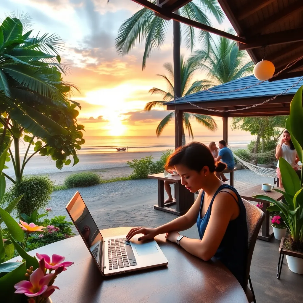 Imagine a serene beachside cafe in Bali, Indonesia, where a digital nomad is typing away on their laptop amidst lush greenery and a vibrant sunset. The atmosphere is relaxed, with a few fellow travelers sipping coffee and chatting in the background. Incorporate tropical flowers, palm trees, and a hammock in the scene.