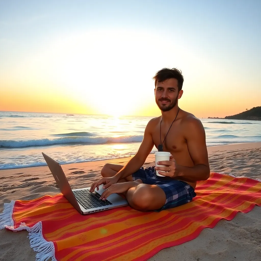 As a digital nomad, I'm sitting on a tropical beach, laptop open, and a refreshing coconut drink by my side. The sun is setting, casting a warm golden glow over the ocean. I'm surrounded by lush greenery and the sound of waves gently lapping at the shore. Create an image that captures the serenity and freedom of this moment.