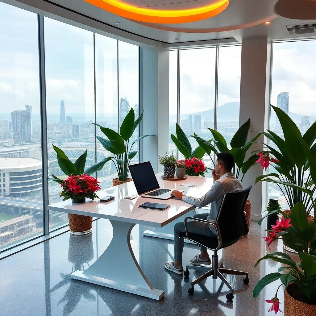 Create an image of a futuristic co-working space with a tropical twist. A digital nomad sits at a sleek, minimalist desk, surrounded by lush greenery and vibrant flowers. A cityscape or beachside view is visible through the floor-to-ceiling windows. The atmosphere is relaxed, with a warm glow and a hint of adventure.