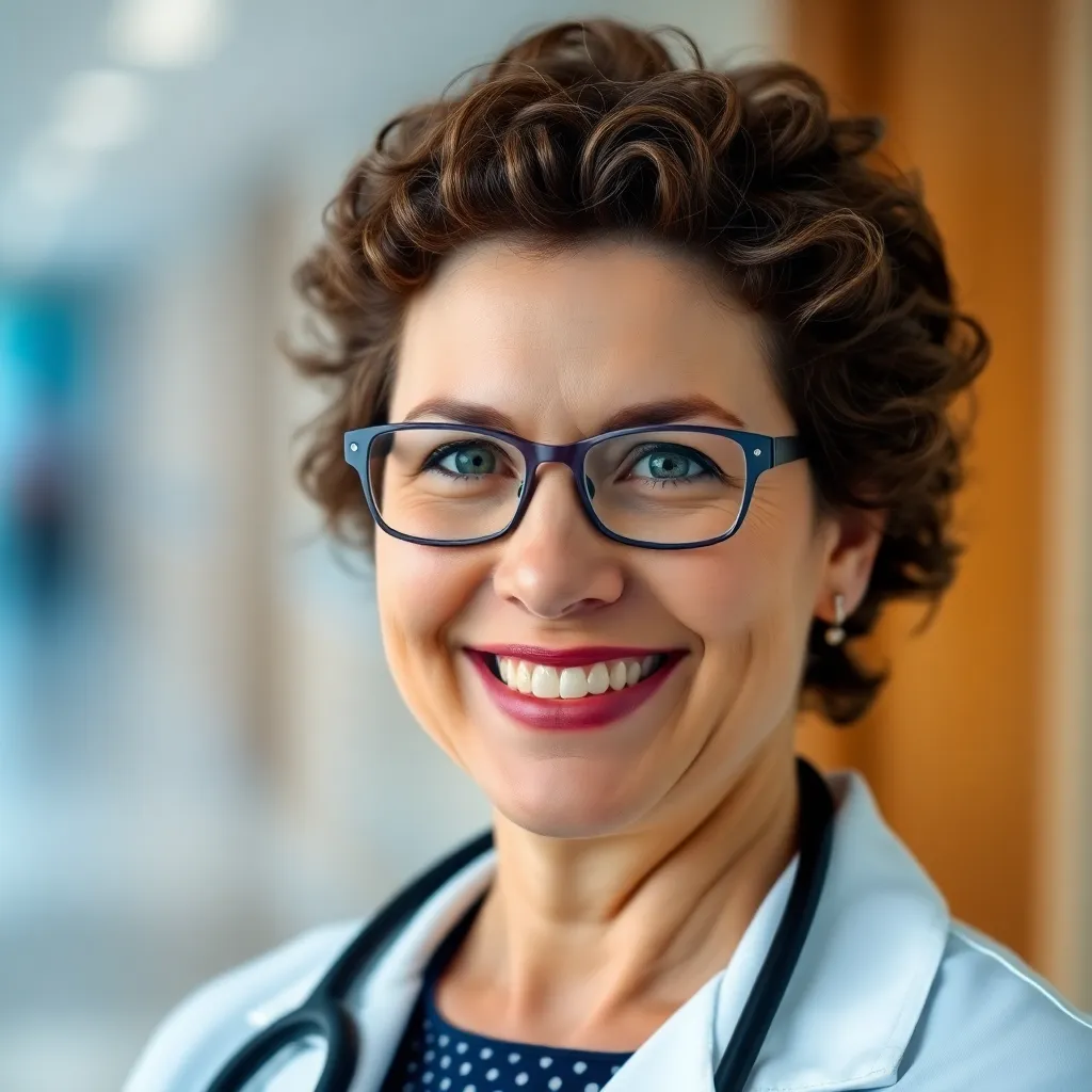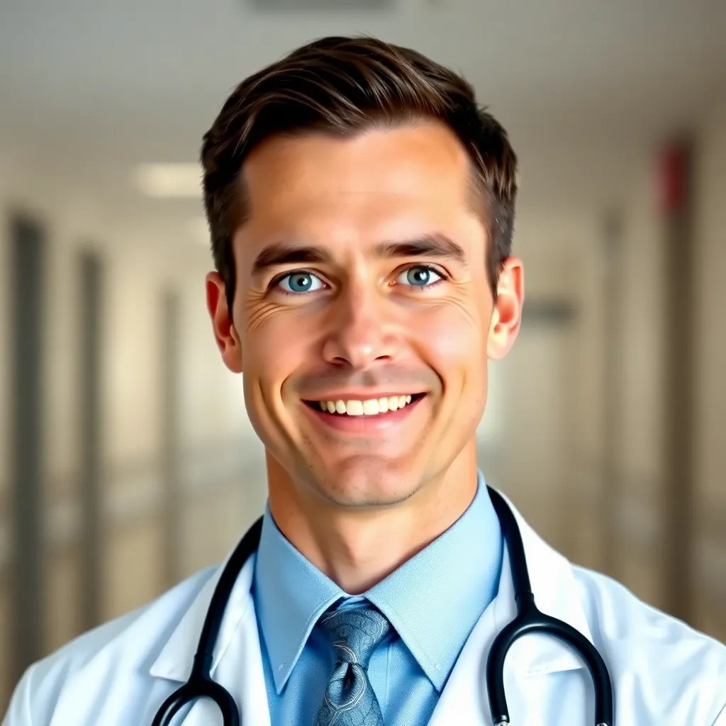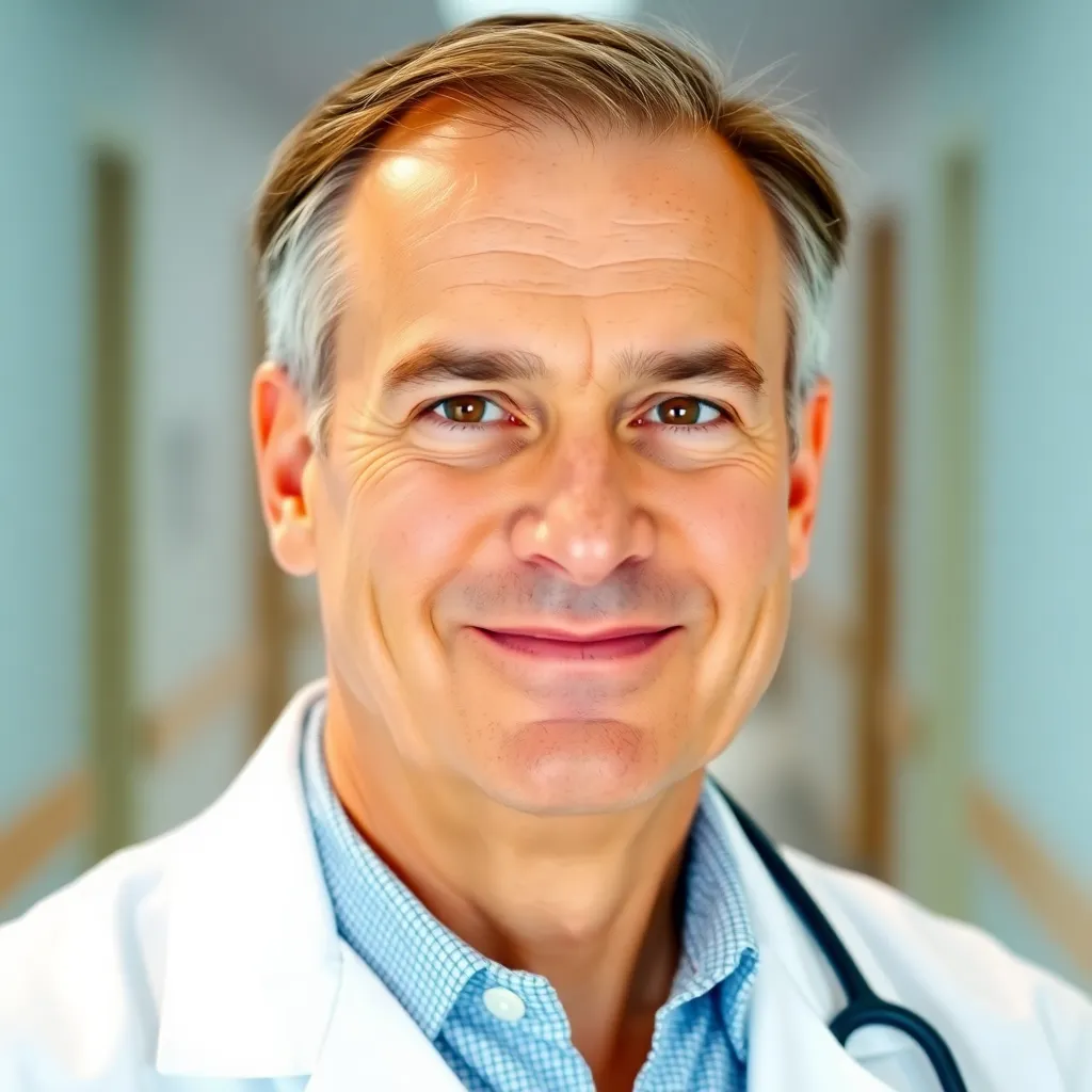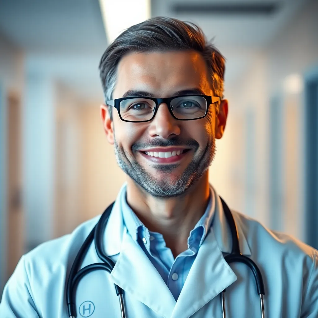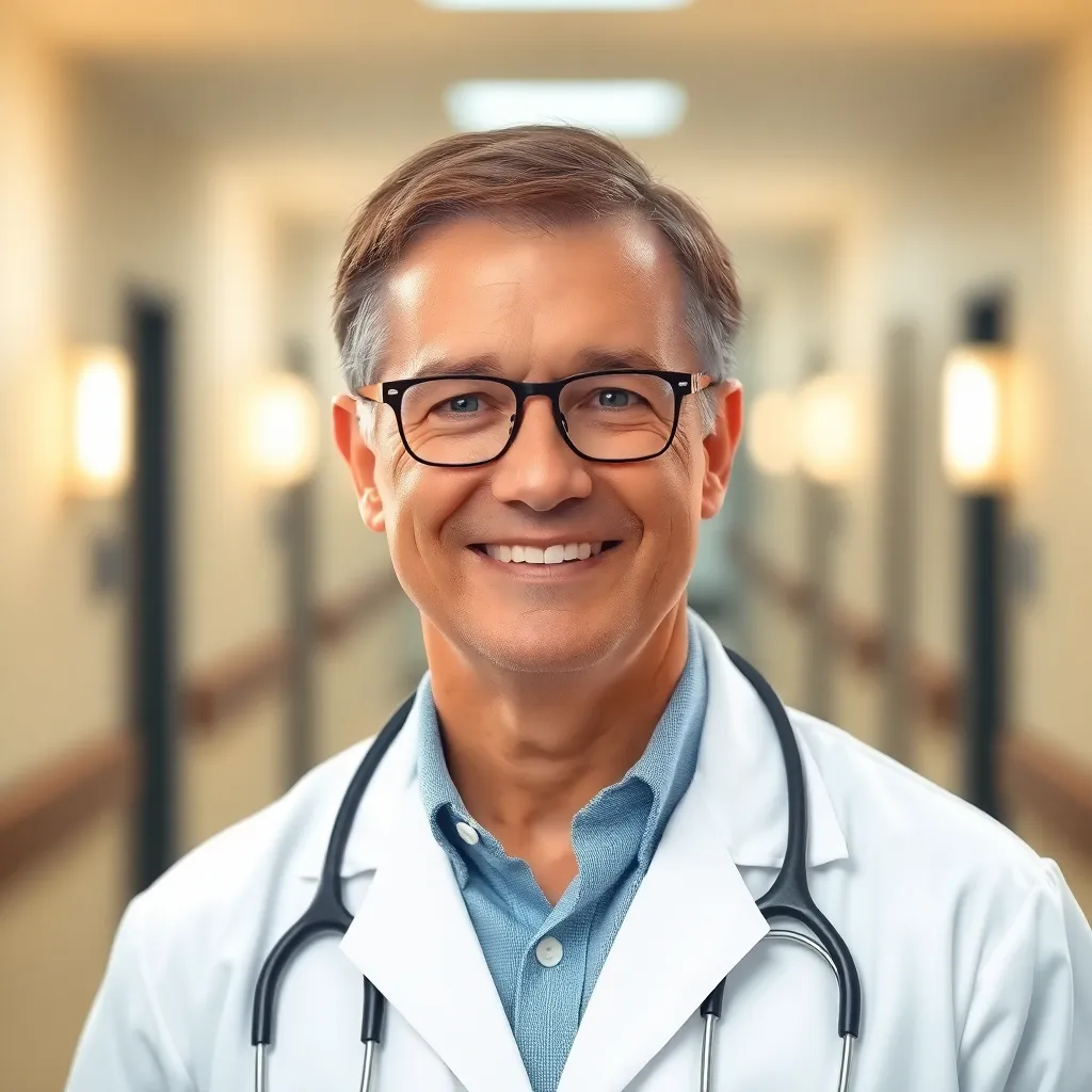 Create an AI-generated headshot of a middle-aged doctor with a friendly and approachable demeanor. The doctor should be wearing a white lab coat with a stethoscope around their neck. The background should be a blurred hospital corridor with soft, warm lighting. The doctor's eyes should be bright and inviting.