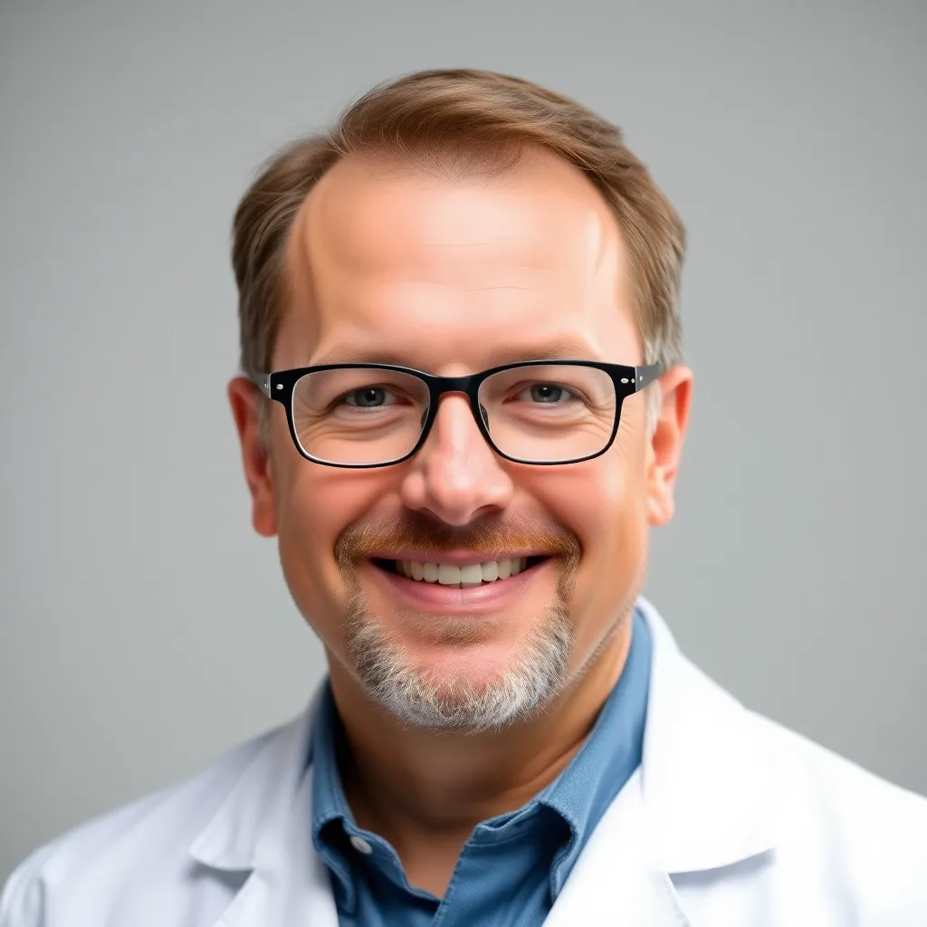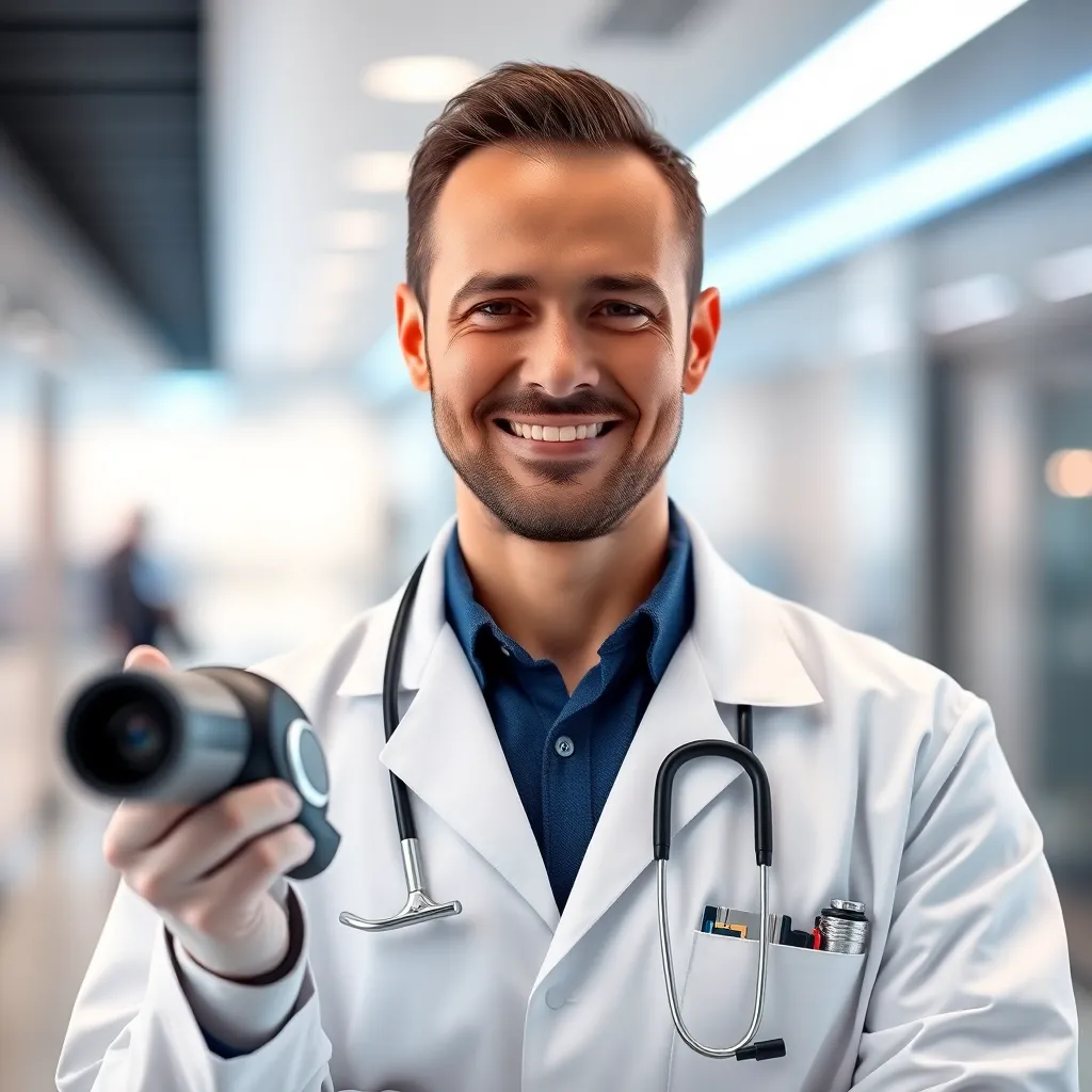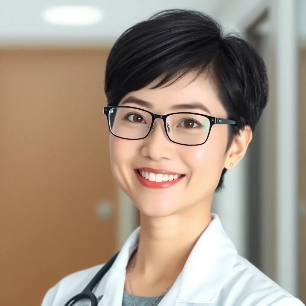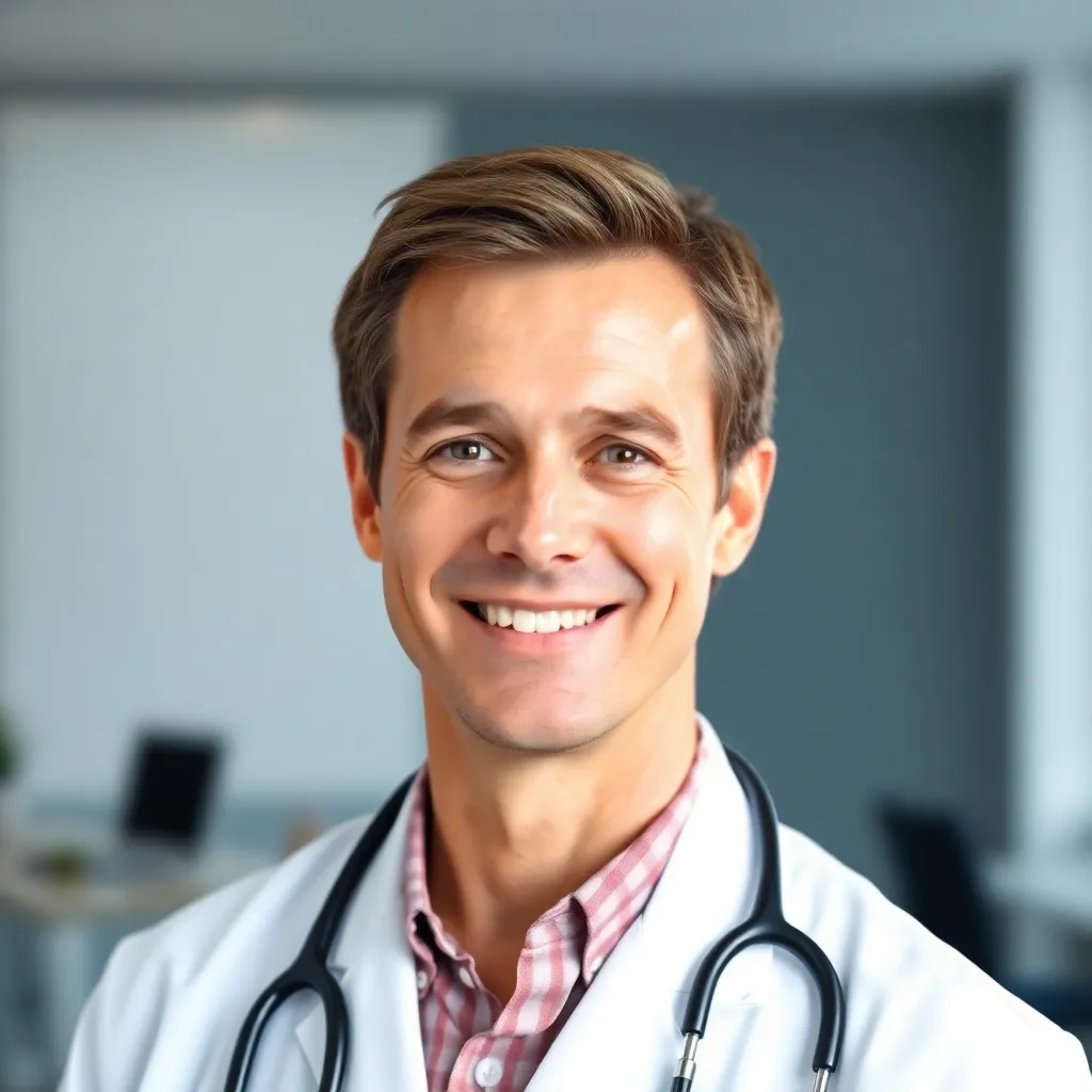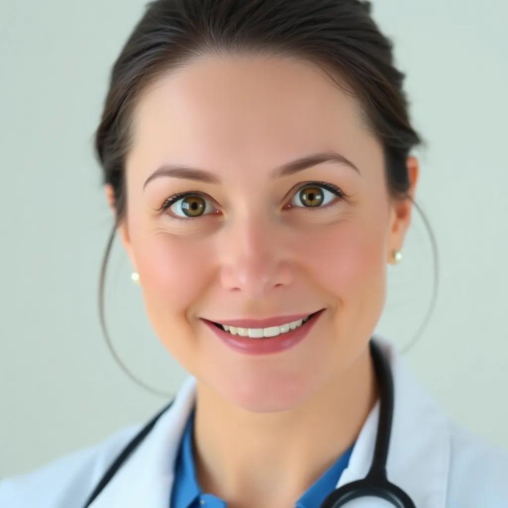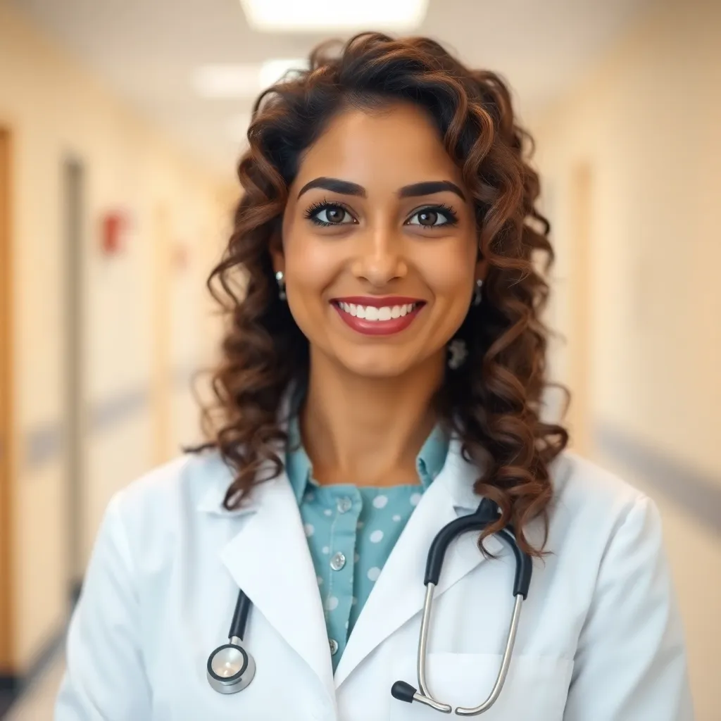 Create an AI-generated headshot of a middle-aged doctor with a friendly and approachable demeanor. The doctor should be wearing a white lab coat with a stethoscope around their neck. The background should be a blurred hospital corridor with soft, warm lighting. The doctor's eyes should be bright and inviting.