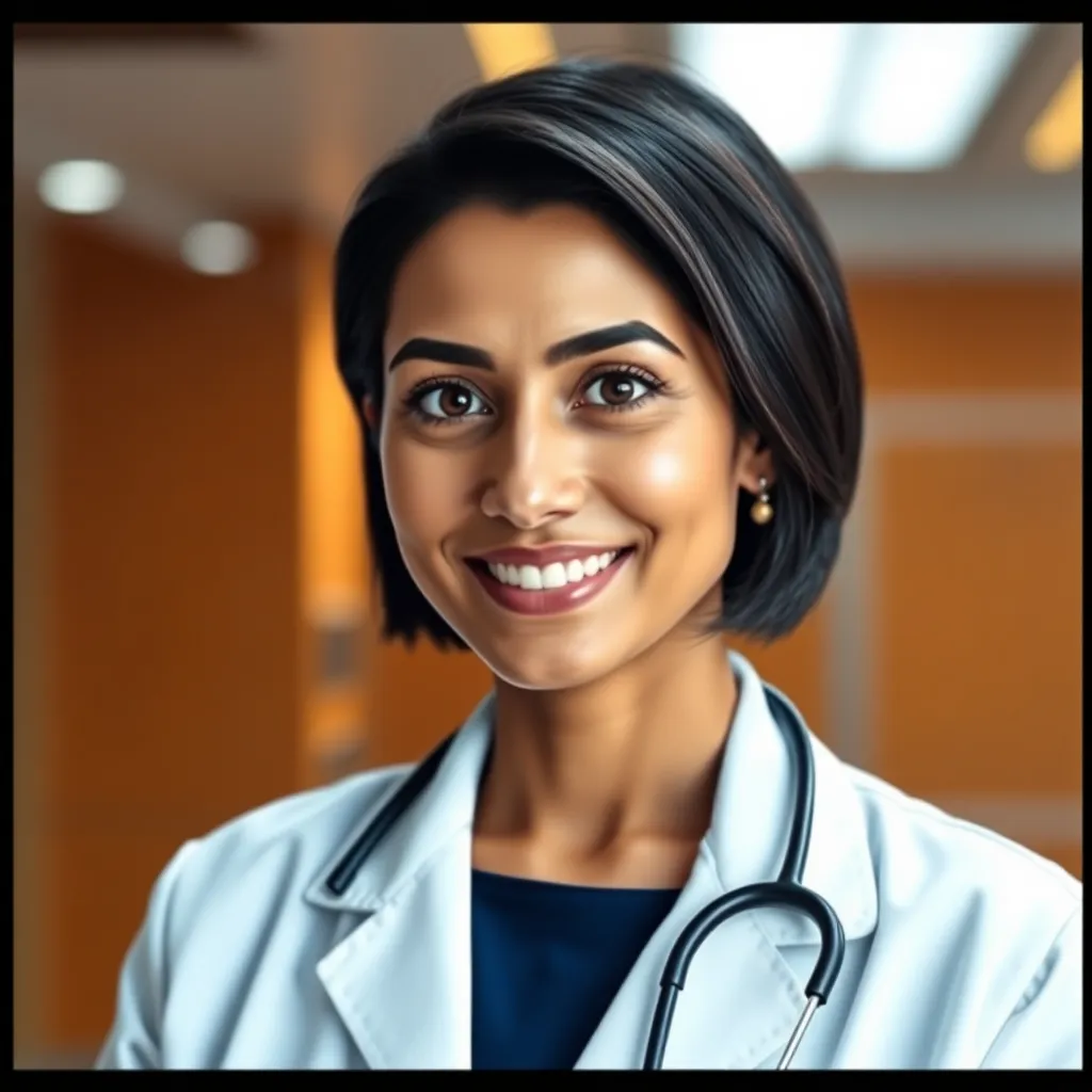 Create a high-quality AI image of a professional doctor with a friendly and approachable expression. The doctor should be wearing a white lab coat with a stethoscope around their neck. The background should be a blurred hospital or medical setting. The image should be well-lit and in a warm color tone.