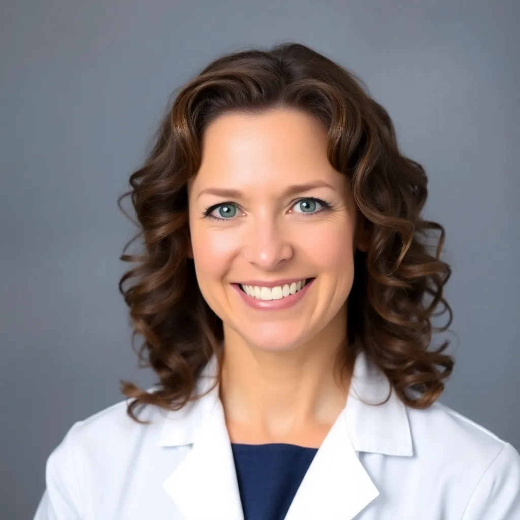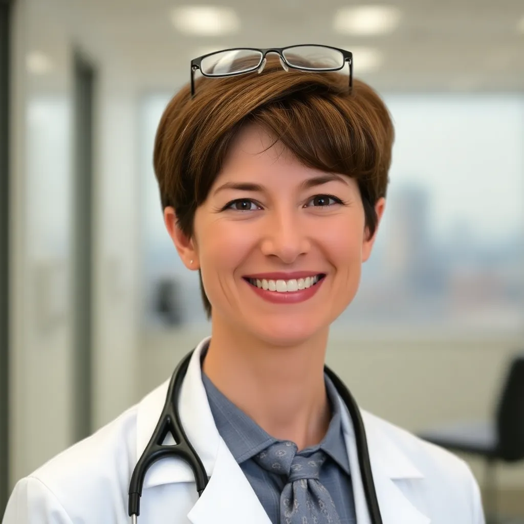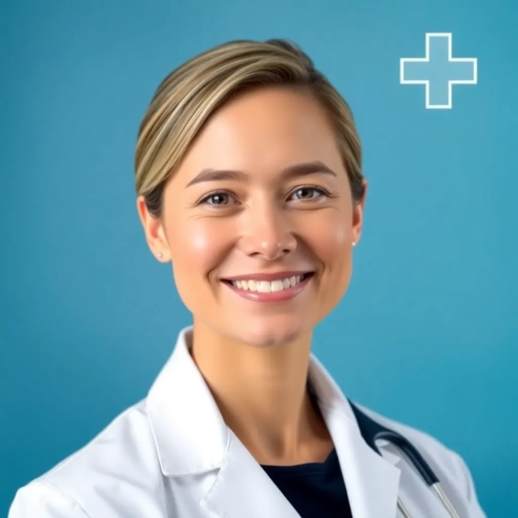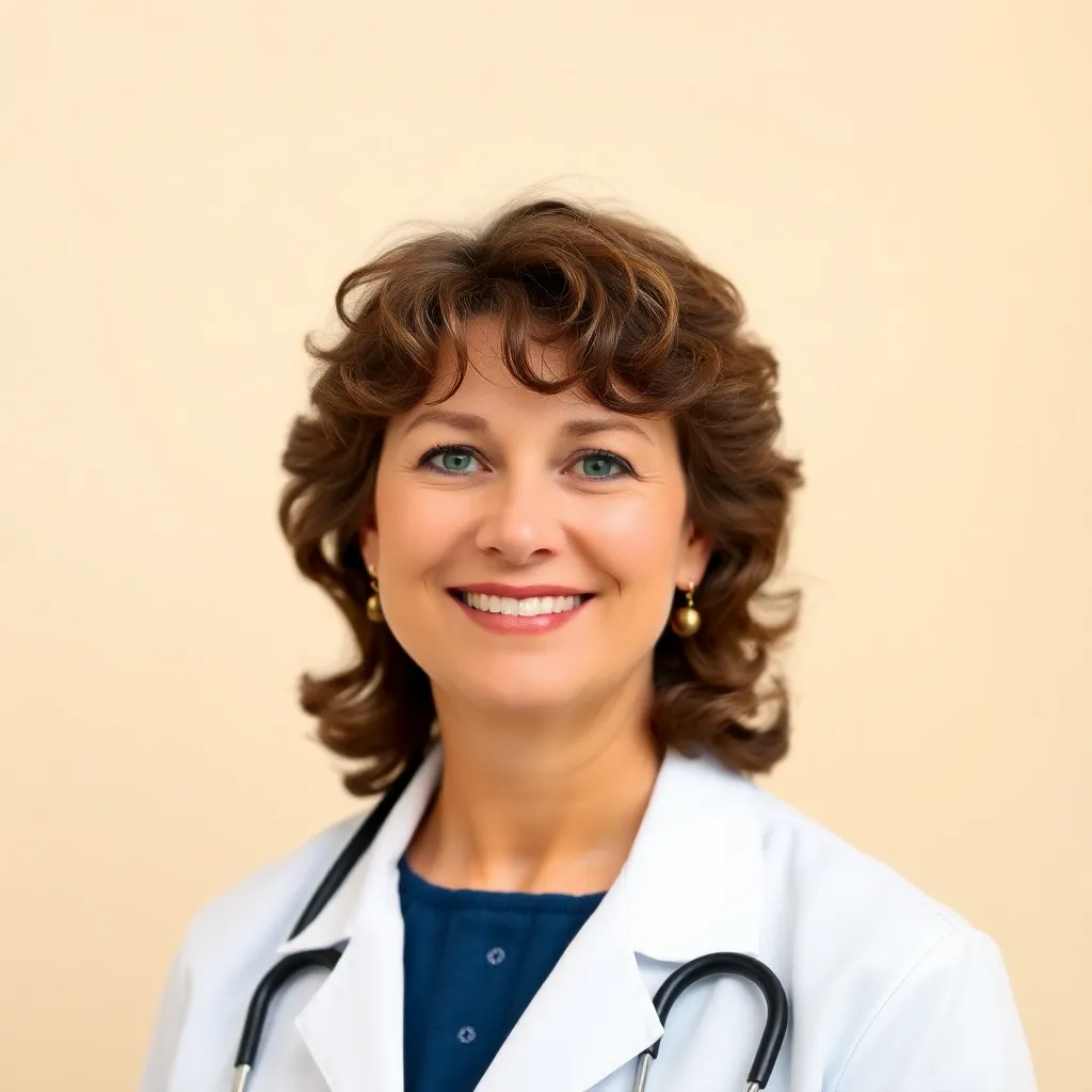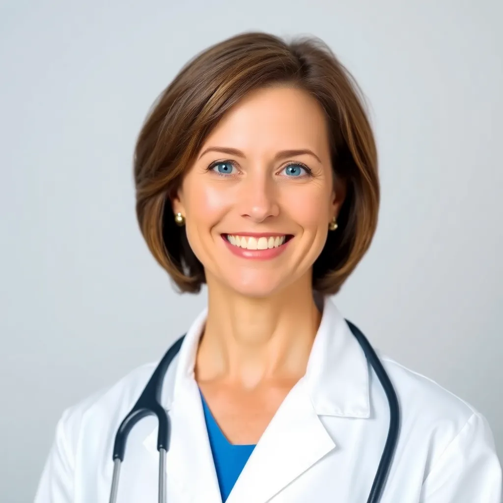 Create a professional headshot of a doctor with a friendly and approachable demeanor. The doctor is a middle-aged woman with short brown hair and bright blue eyes. She is wearing a white coat with a stethoscope around her neck and a warm smile. The background is a subtle gradient of blues and whites.