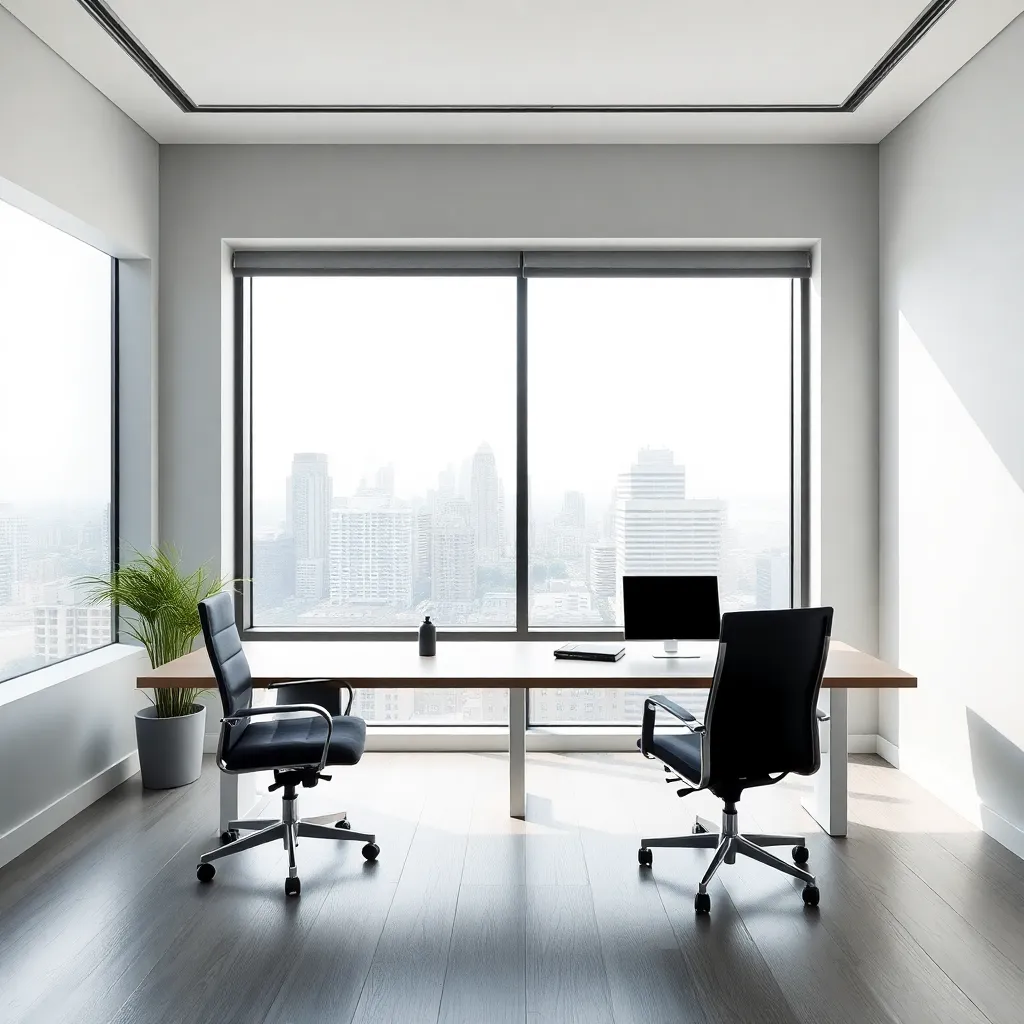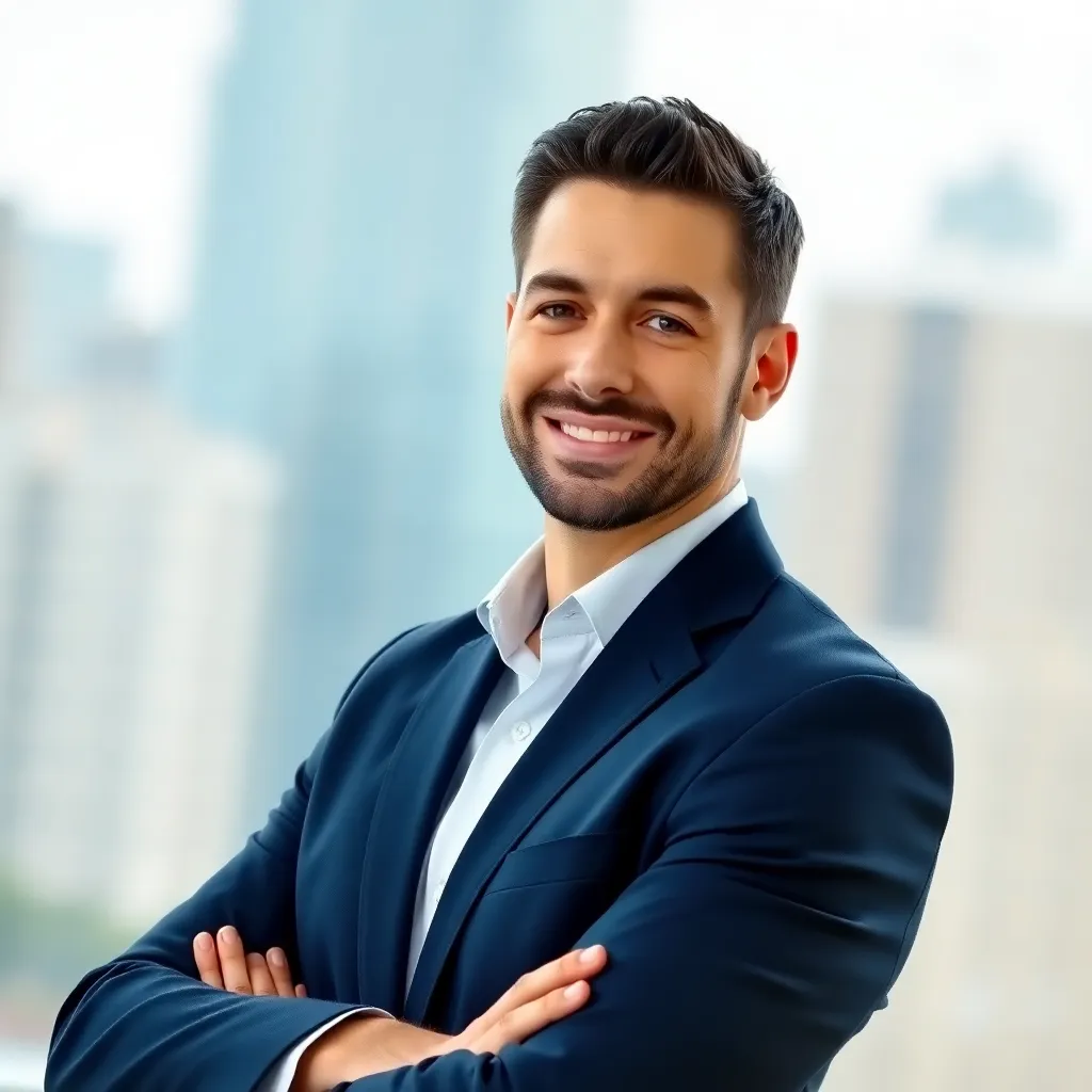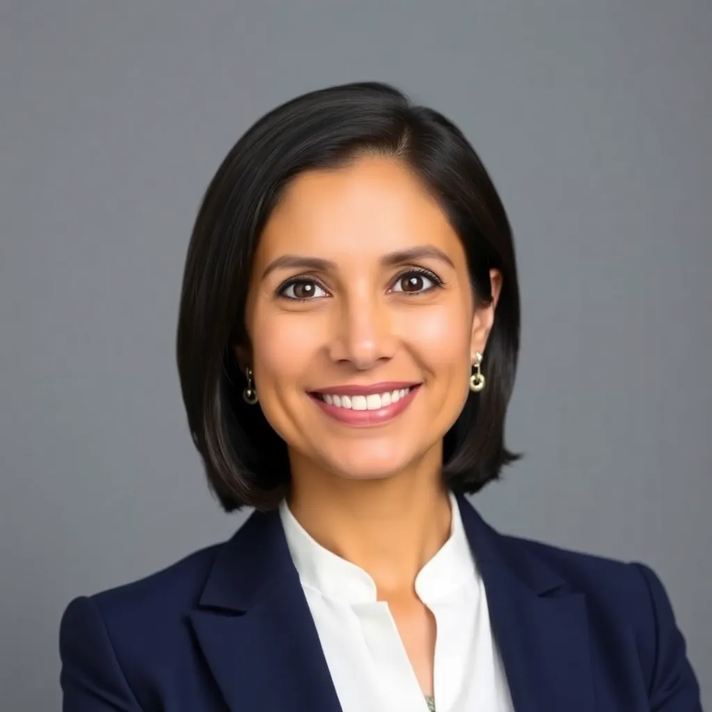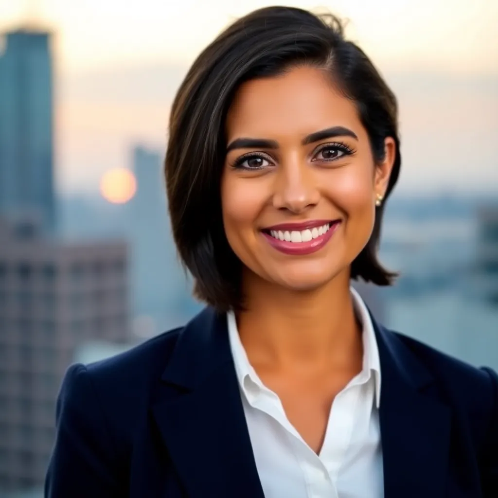 Create a professional headshot of a successful businesswoman, Dr. Sophia Patel, with short, dark hair and a warm smile. She's wearing a crisp white blouse and a tailored navy blue blazer, with a subtle background of a cityscape at sunset. Exude confidence, intelligence, and approachability in the portrait.
