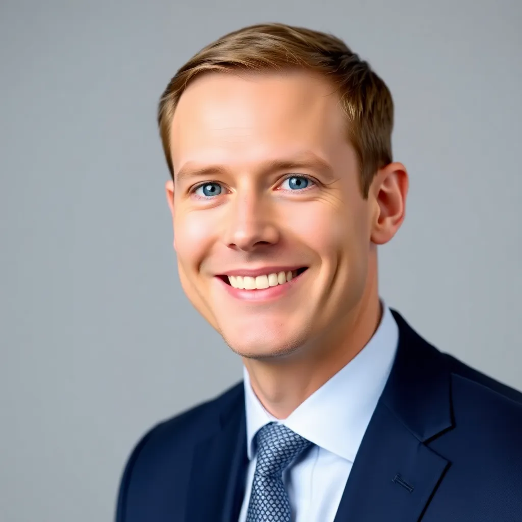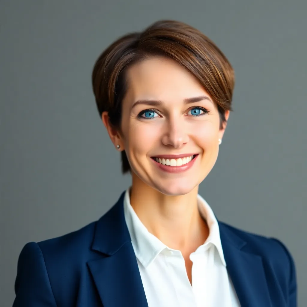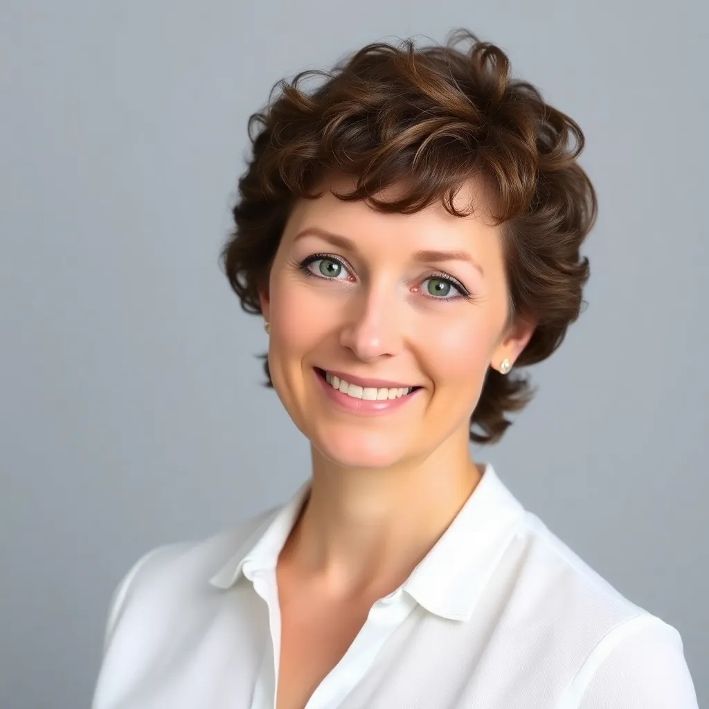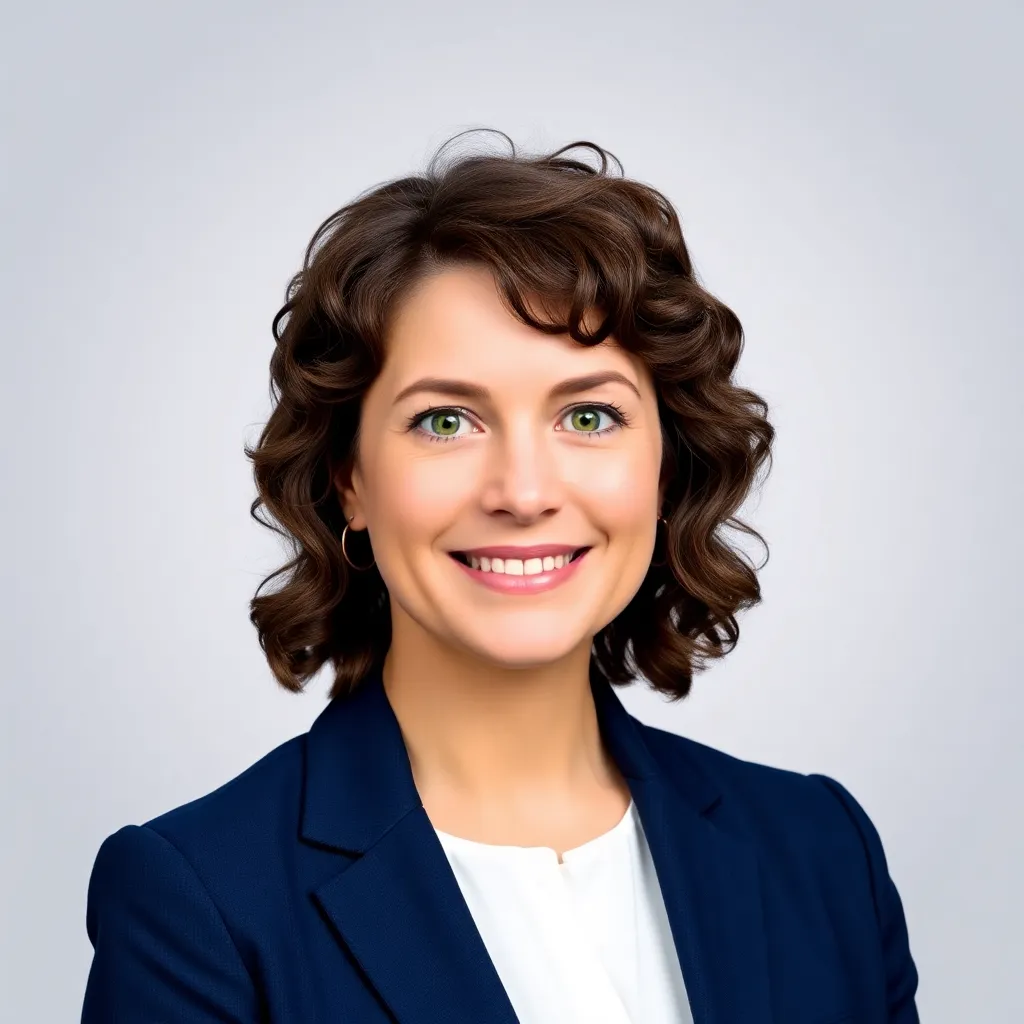 Create a professional headshot of a successful businesswoman, Dr. Emma Taylor, with a warm and approachable smile. She has short, curly brown hair and piercing green eyes. She's wearing a crisp white blouse and a tailored navy blue suit. The background should be a subtle gradient of blues and whites.