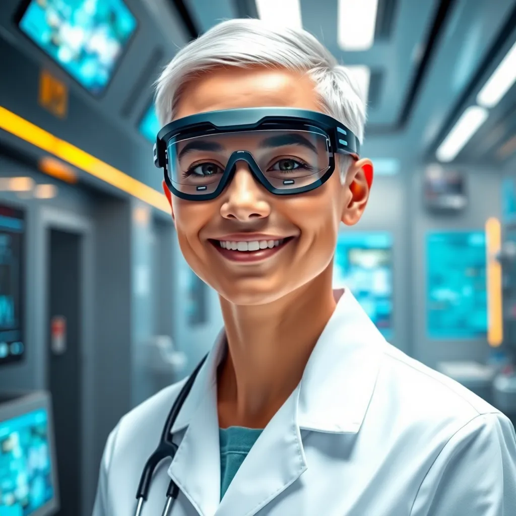 Create a futuristic doctor with a warm smile, wearing a crisp white lab coat and futuristic goggles. The background is a sleek, high-tech medical facility with holographic screens and machinery. The doctor's hair is short and neat, with a hint of silver at the temples, conveying wisdom and expertise.