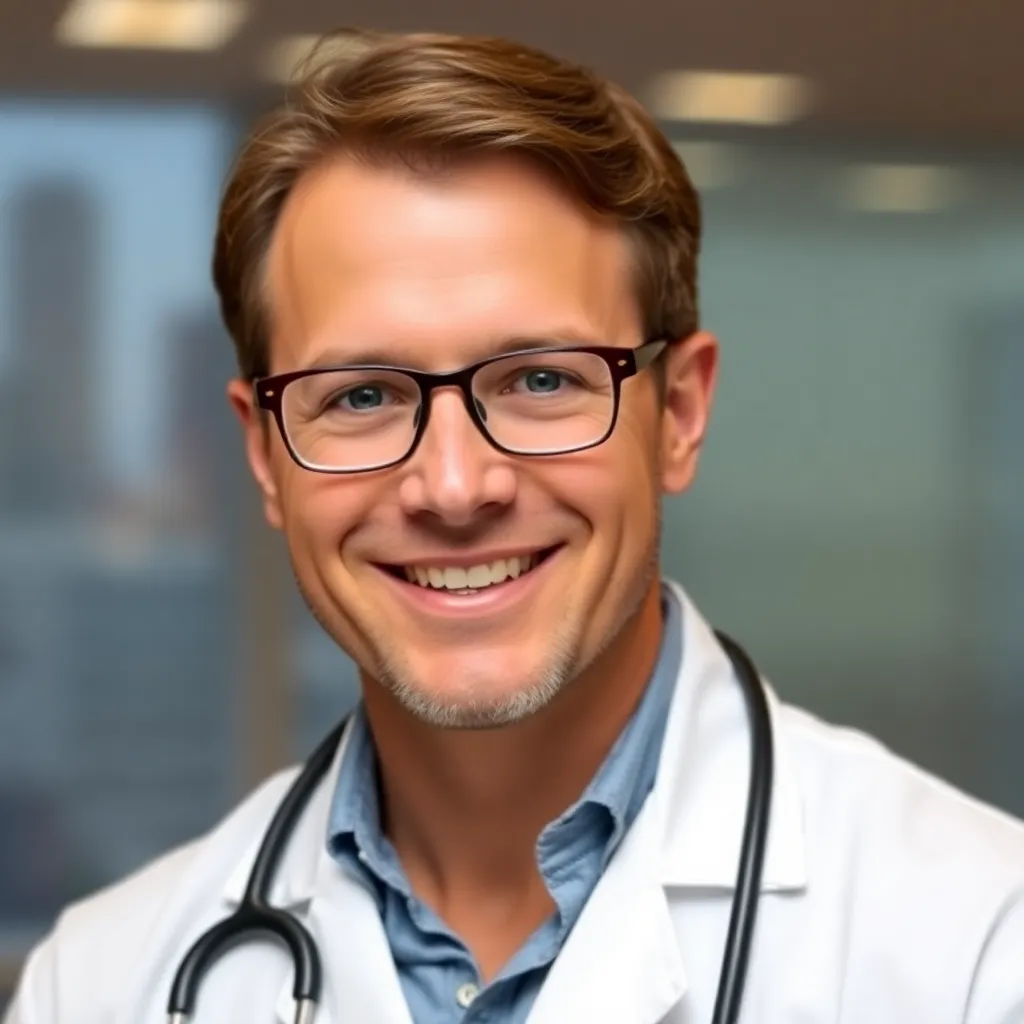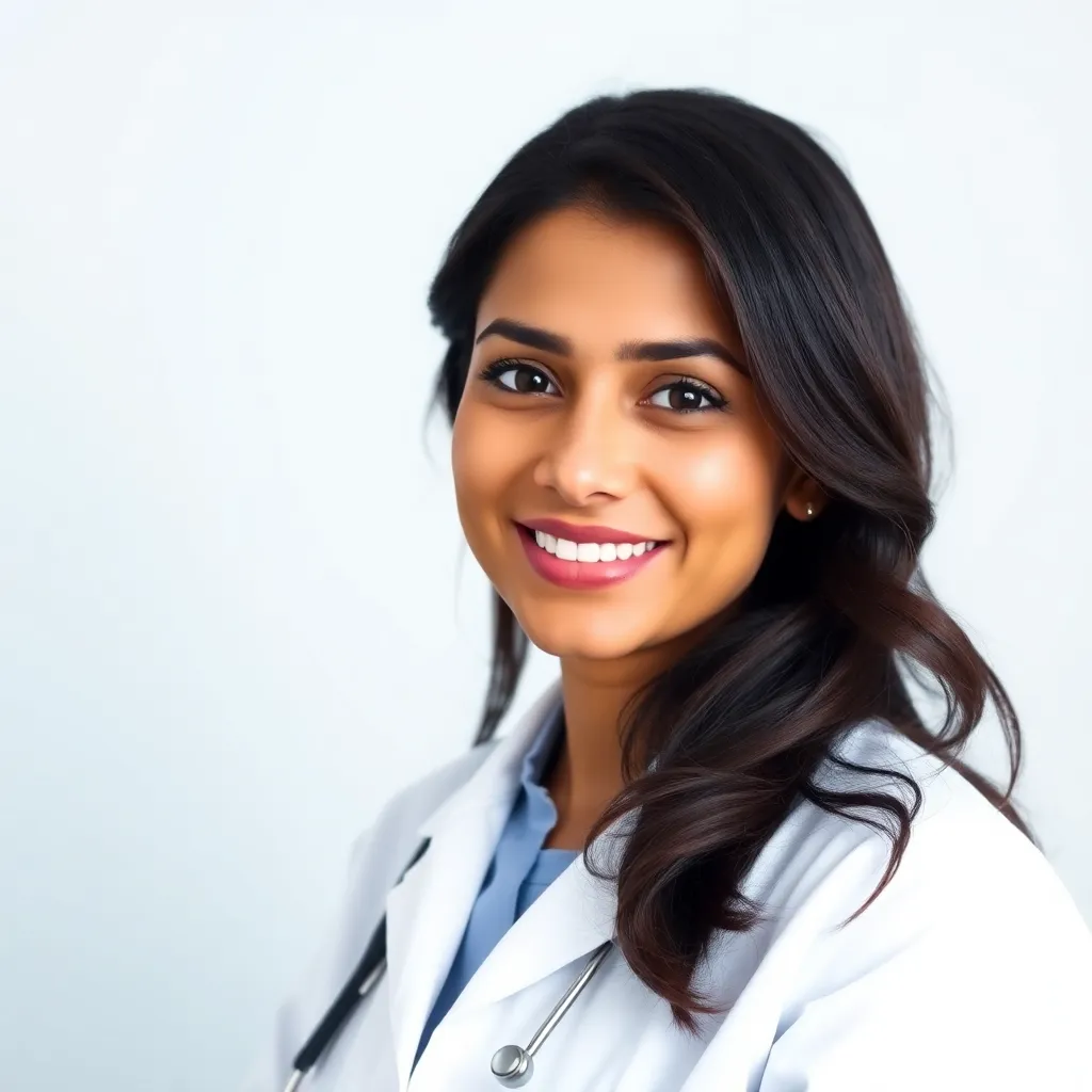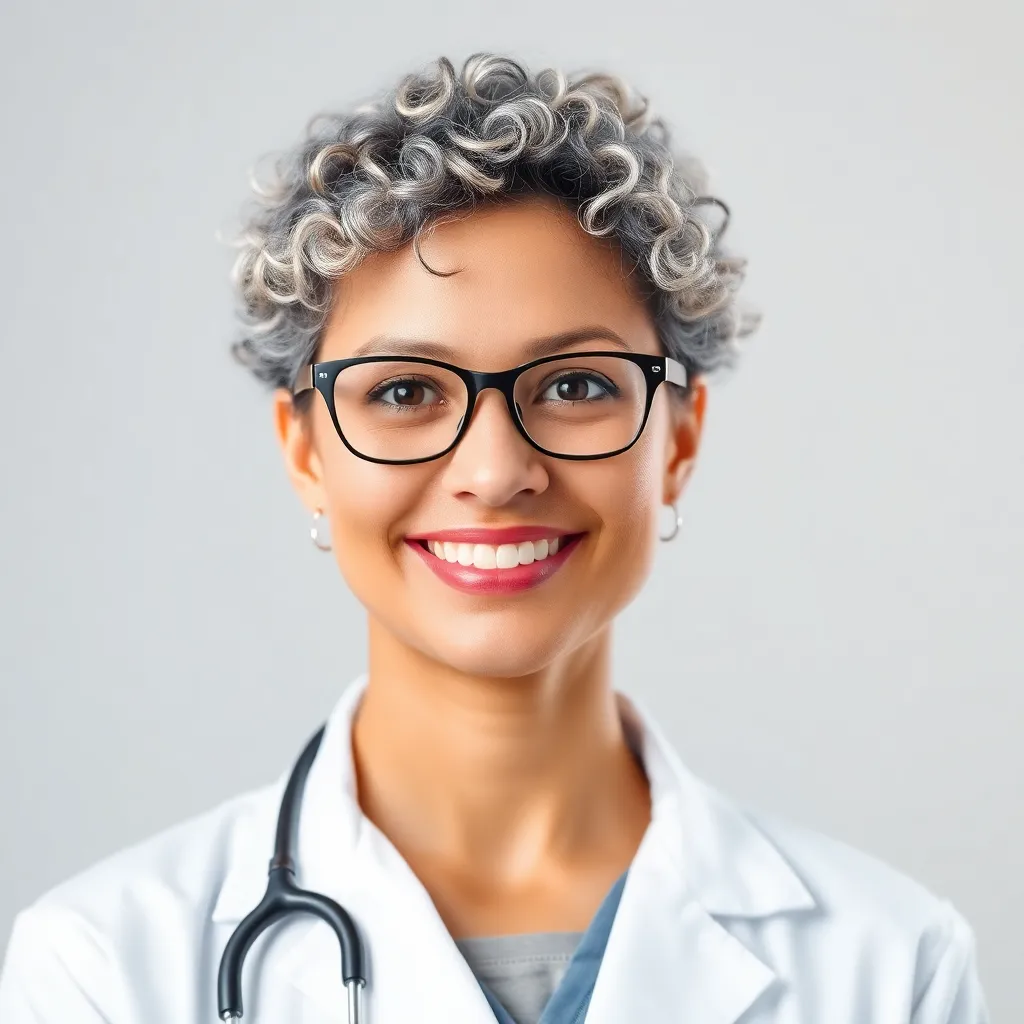 Create a high-quality AI-generated headshot of a confident and charismatic doctor, dressed in a crisp white coat with a subtle smile, against a clean white background. Incorporate a stethoscope and a pair of glasses for a professional and approachable look. The image should exude trust, expertise, and warmth.