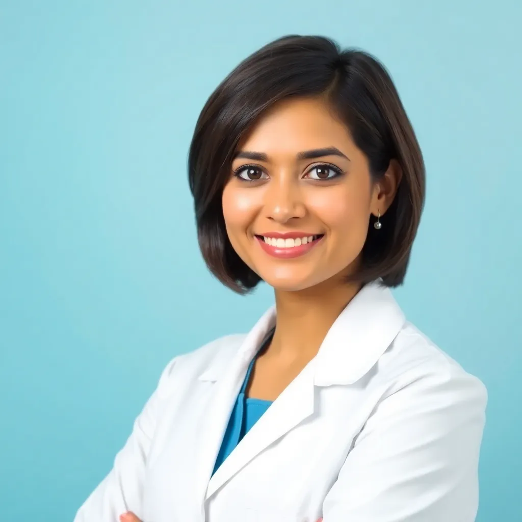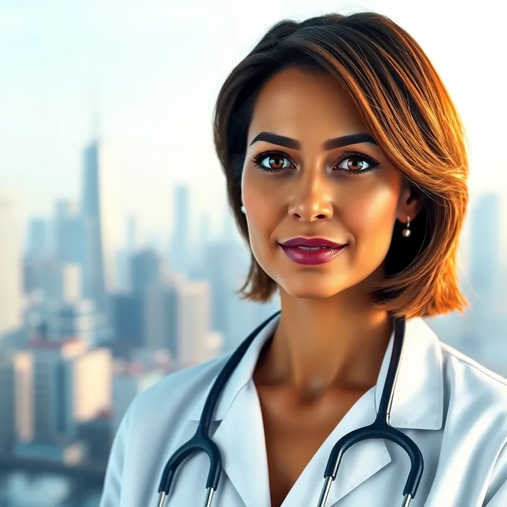 Create a futuristic medical portrait of Doctor Sophia Patel, a renowned neurosurgeon. She's in her mid-40s, with short brown hair and warm brown eyes. Her expression is focused and confident. She wears a crisp white lab coat with a silver stethoscope around her neck, with a subtle futuristic cityscape in the background.