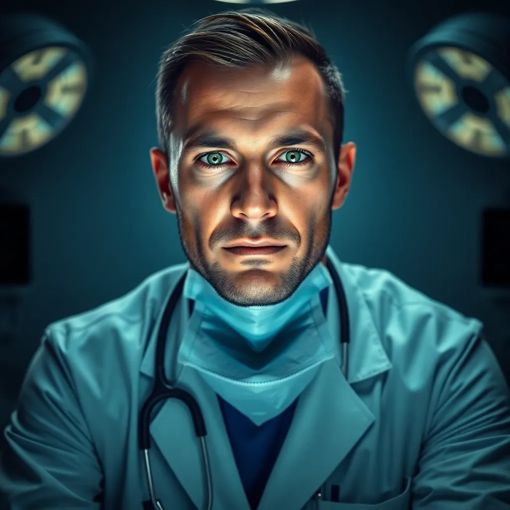 Create a high-stakes, futuristic doctor's headshot. The subject, a brilliant and confident neurosurgeon, sits in a dimly lit operating room. Focused intensity radiates from their piercing green eyes, as they wear a crisp white lab coat with a silver surgical mask dangling from their neck. What's the doctor's expression?