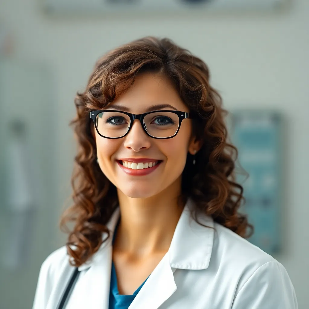 Create a stunning headshot of a fictional doctor, Dr. Emma Taylor, with piercing green eyes, curly brown hair, and a warm smile. She's dressed in a crisp white lab coat with a subtle pattern of tiny medical symbols. The background is a blurred cityscape at sunset, with a faint hint of a hospital building.