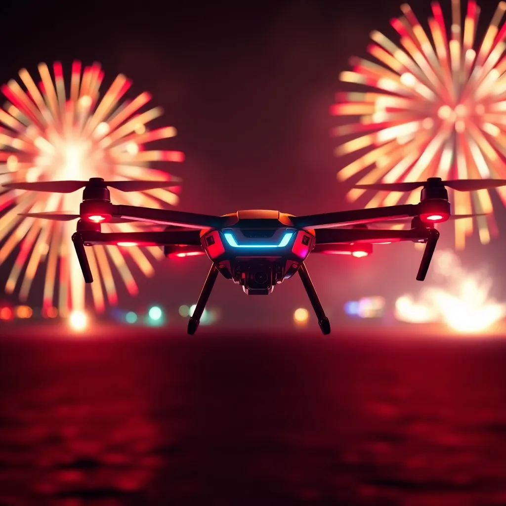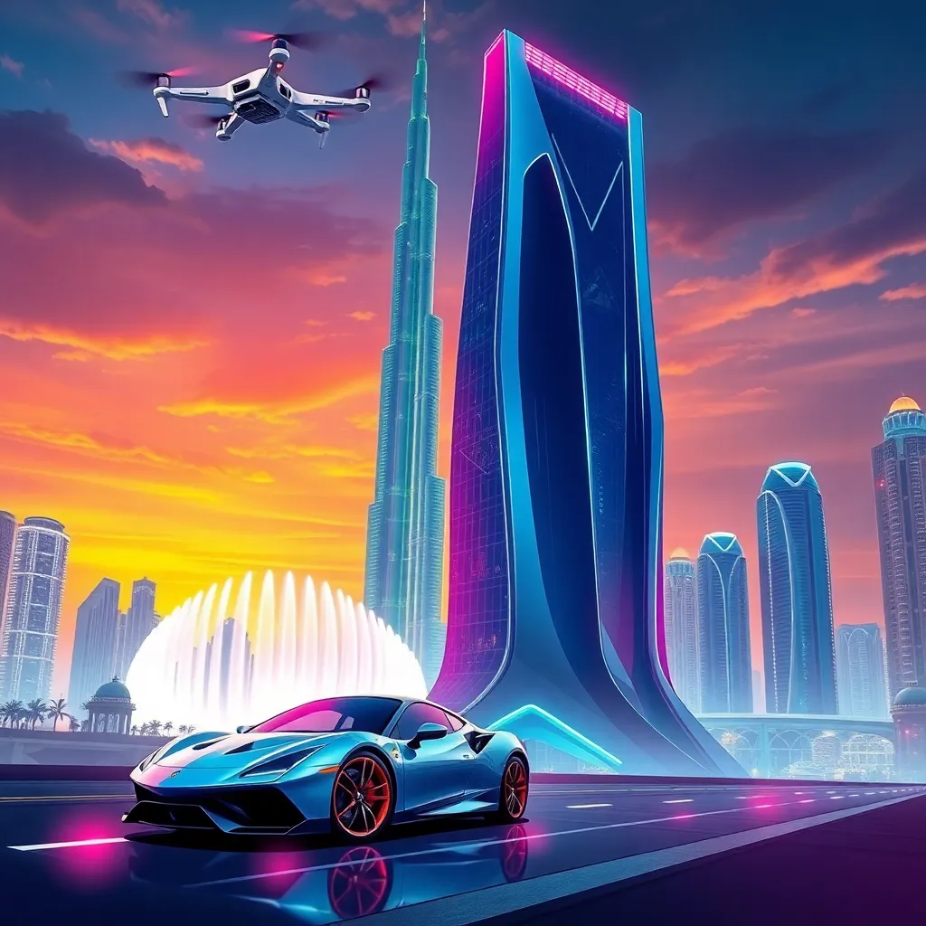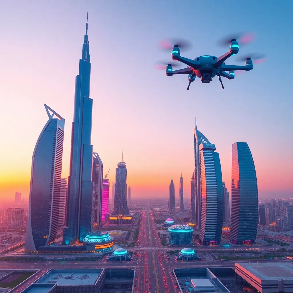 Create an AI-generated image of a futuristic Dubai cityscape at sunset, with sleek skyscrapers and modern architecture. Incorporate iconic landmarks like the Burj Khalifa and Dubai Mall. Add vibrant colors and neon lights to capture the city's lively atmosphere. Include a futuristic drone flying above the city, with a subtle glow.