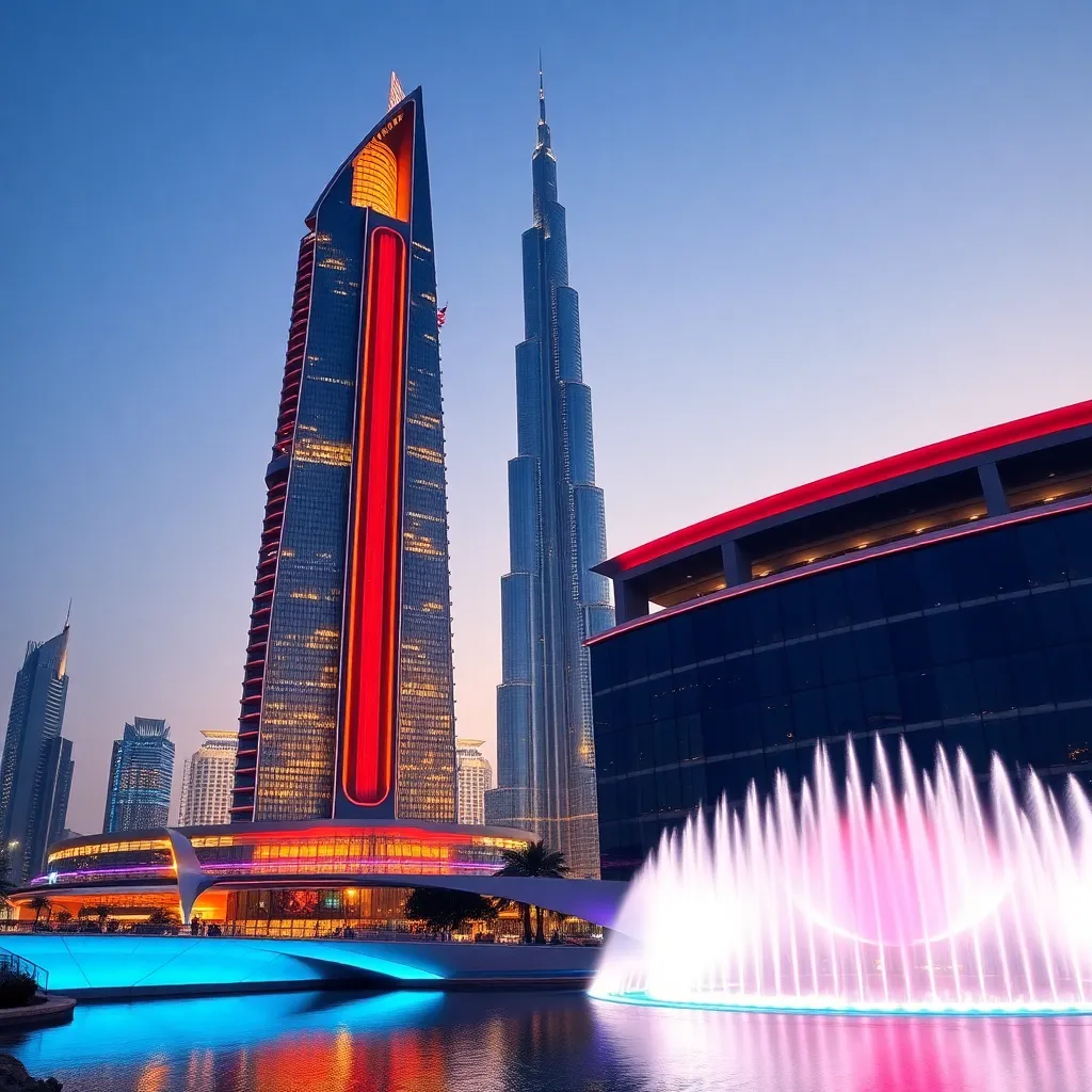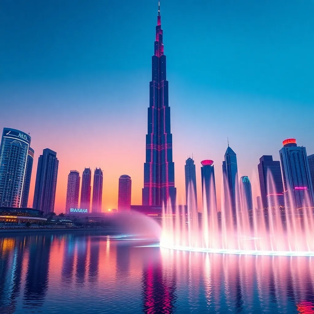 Imagine a futuristic skyscraper in Dubai, with sleek glass and steel architecture, illuminated at night with vibrant neon lights. The Burj Khalifa stands tall in the background, with the Dubai Fountain's water show creating a mesmerizing display of color and light. What does this stunning Dubai cityscape look like?