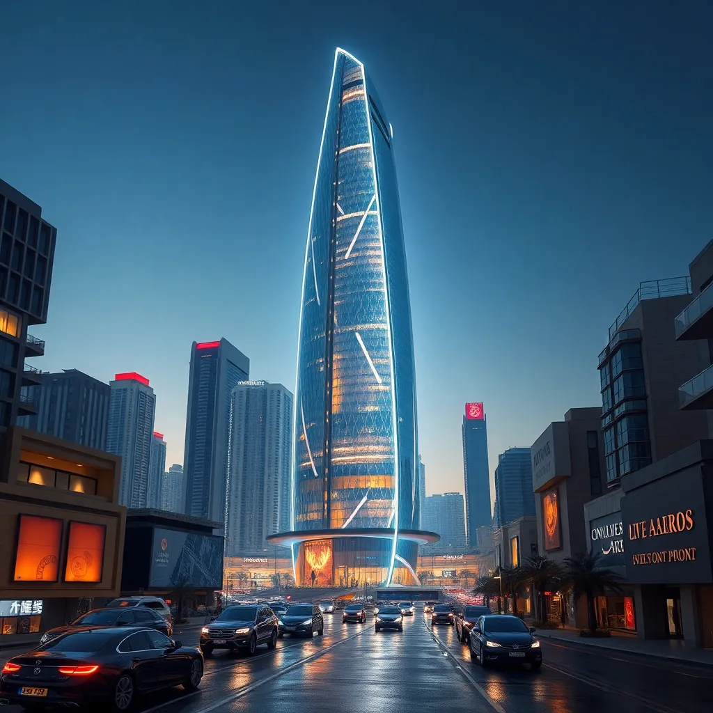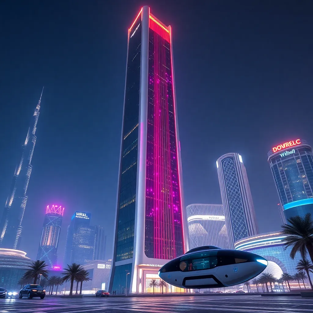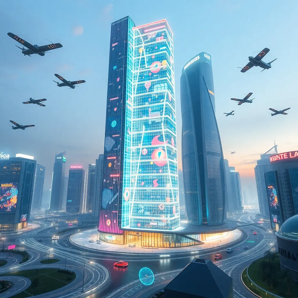 Imagine a futuristic skyscraper in Dubai's Business Bay, with sleek glass and steel architecture, surrounded by a futuristic cityscape with flying taxis and holographic advertisements. The building's exterior is covered in LED lights that change colors depending on the time of day, creating a mesmerizing display of light and sound.