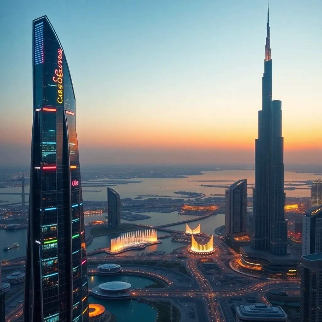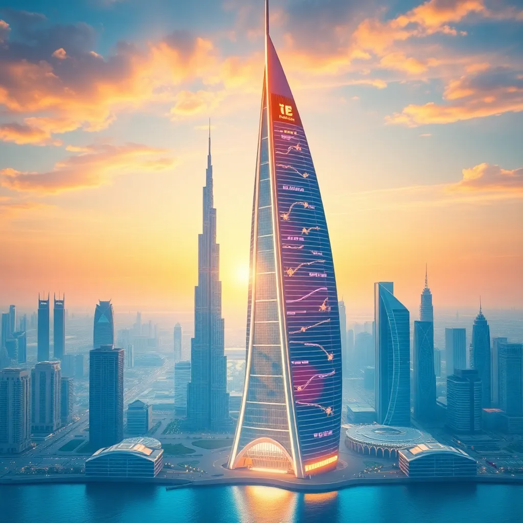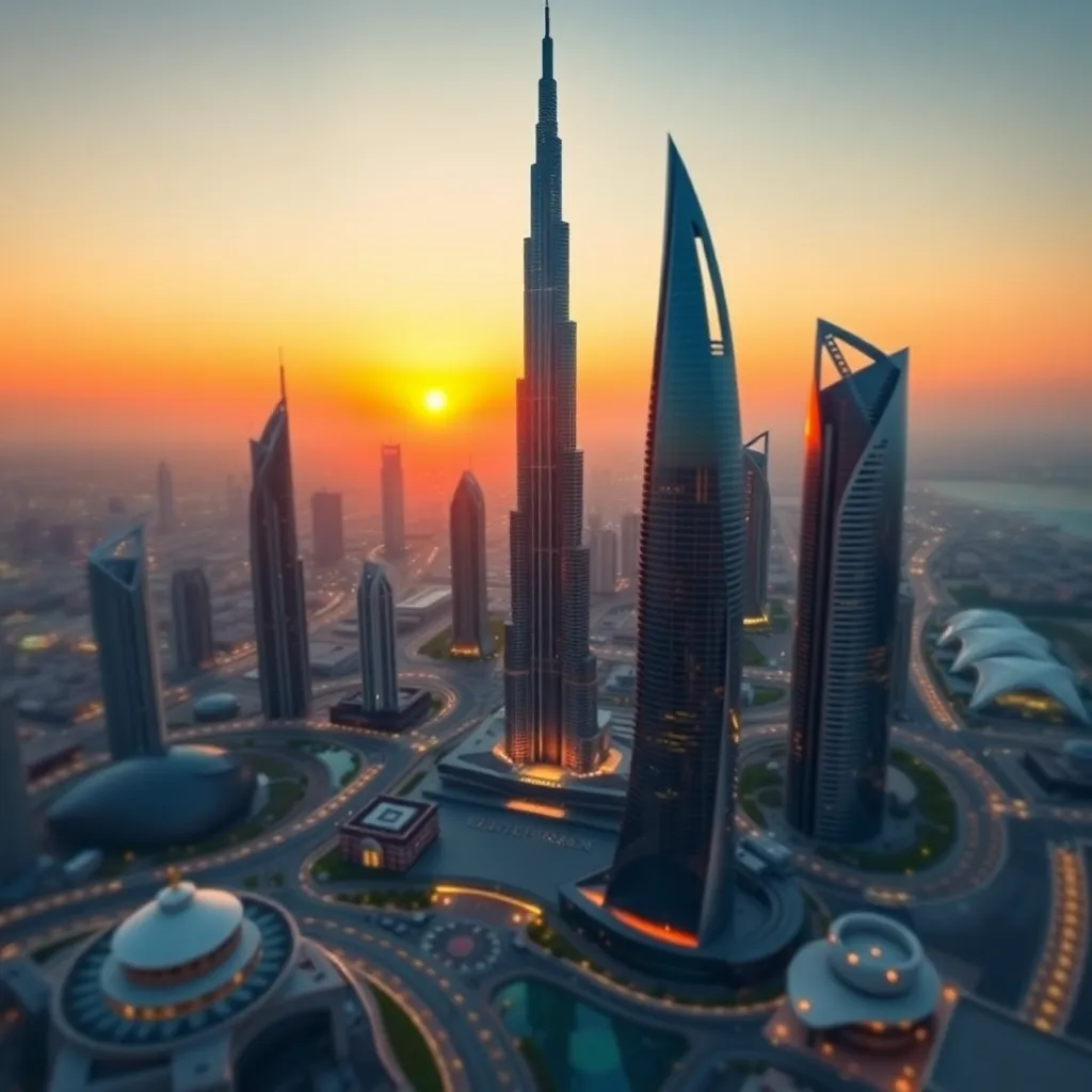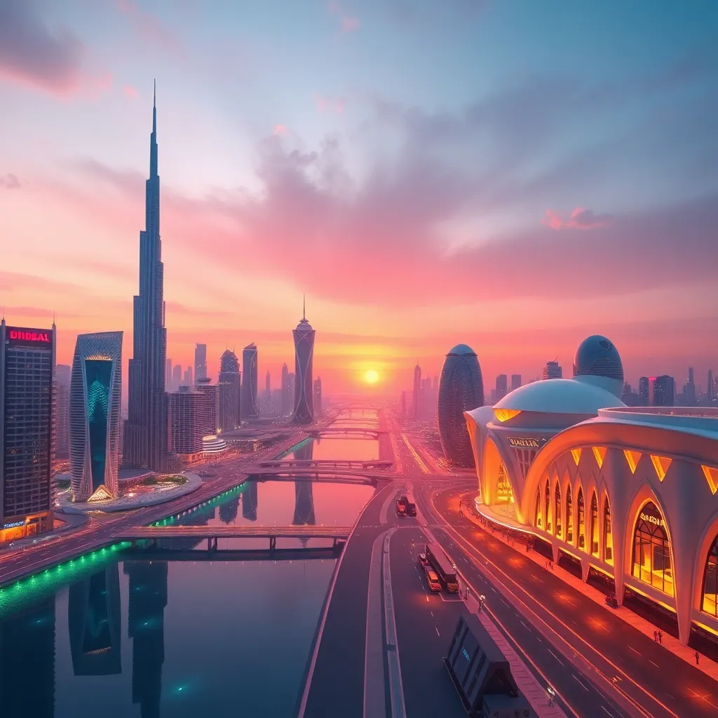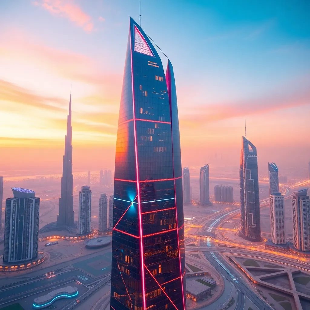 Create an AI-generated image of a futuristic skyscraper in Dubai, with a sleek and modern design, set against a vibrant cityscape at sunset. Incorporate iconic landmarks like the Burj Khalifa and Dubai Mall, and add a subtle hint of Arabic architecture. Make the image feel dynamic and attention-grabbing.