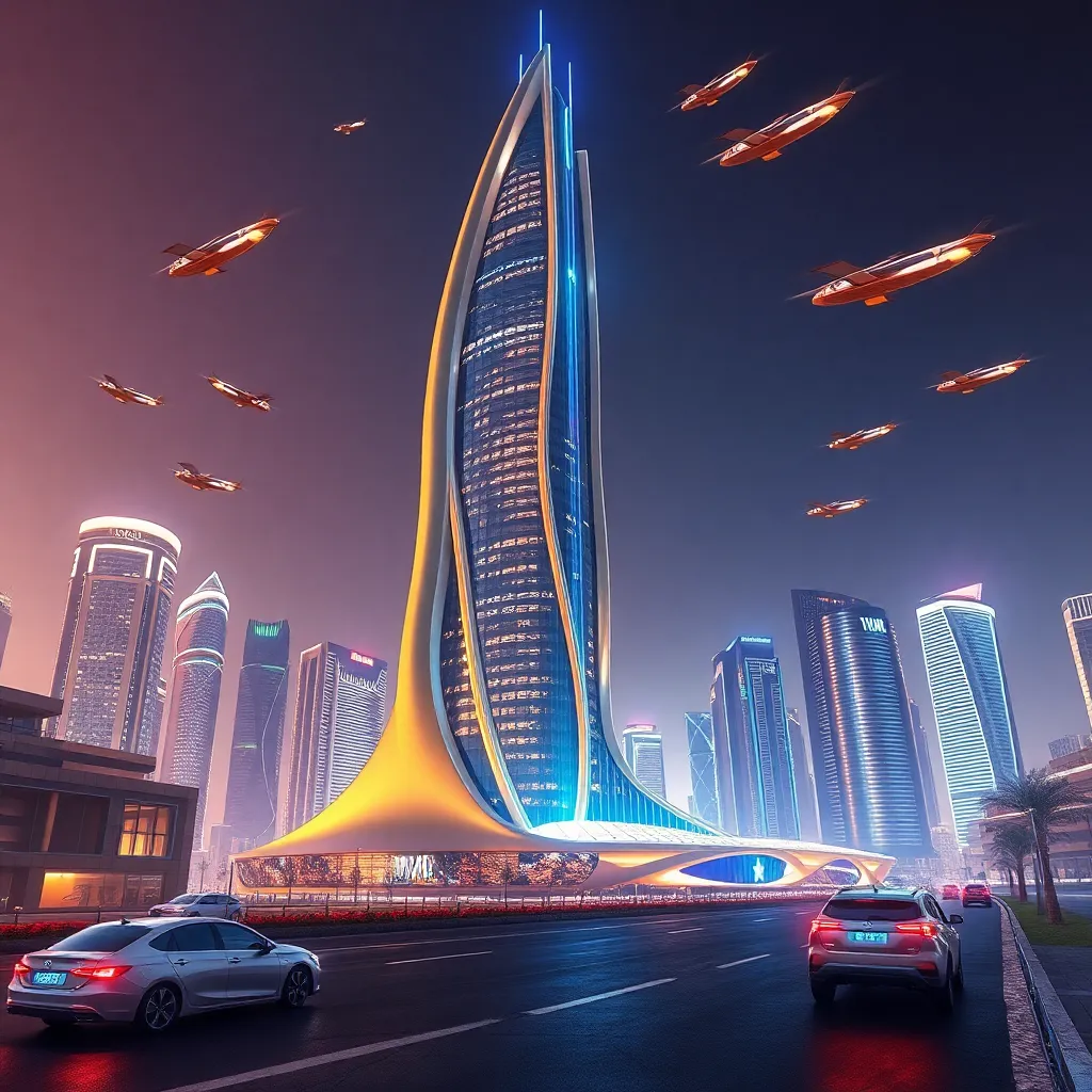 Create a futuristic concept art of a luxurious skyscraper in Dubai's Downtown area. Incorporate sleek, curved lines, and vibrant LED lights. The building should be surrounded by a futuristic cityscape with flying taxis and self-driving cars. Use a bold color palette with shades of gold, silver, and neon blue.