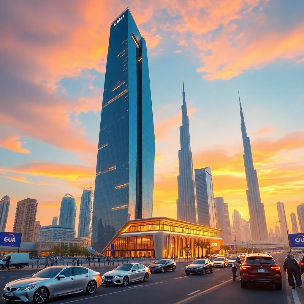 Create an AI-generated image of a futuristic skyscraper in Dubai's iconic Downtown area, with sleek lines, neon lights, and a majestic Burj Khalifa in the background. Incorporate a sleek, luxury car parked in front, and a stunning sunset sky with clouds and palm trees. Use vibrant colors and high-contrast lighting.