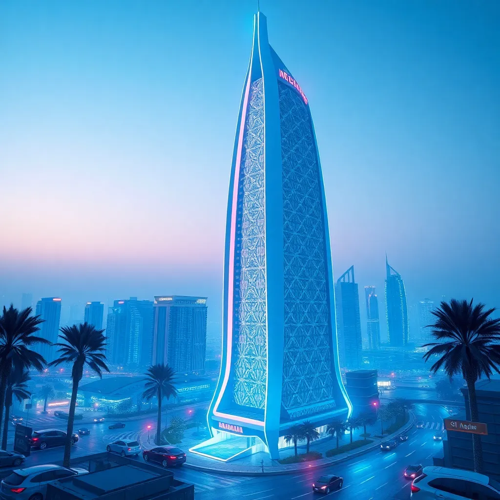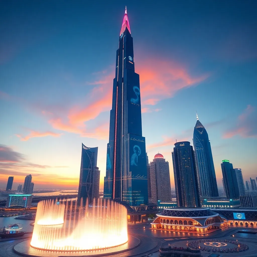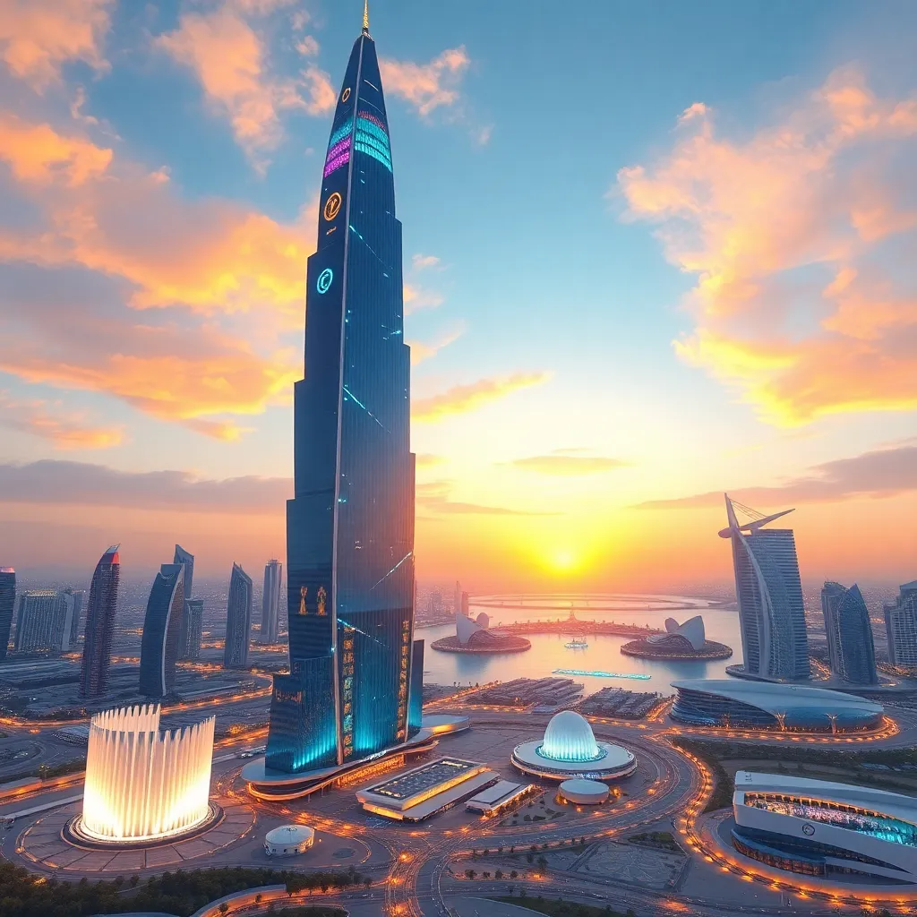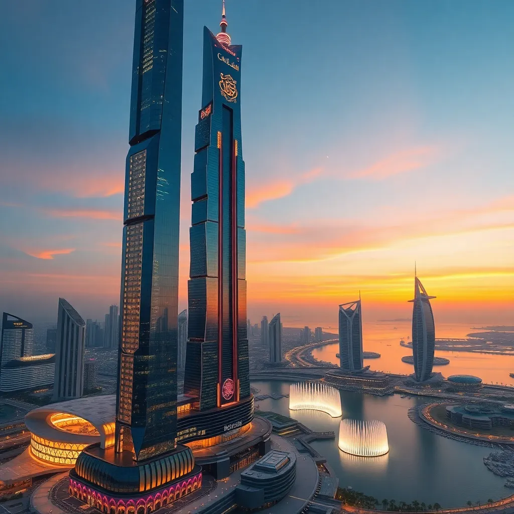 Create an AI-generated image of a futuristic skyscraper in Dubai, with sleek glass and steel architecture, neon lights, and a majestic Burj Khalifa-inspired design. Incorporate a stunning cityscape at sunset, with the Dubai Fountain and Palm Jumeirah in the background. Add a touch of Arabic flair with intricate patterns and calligraphy.