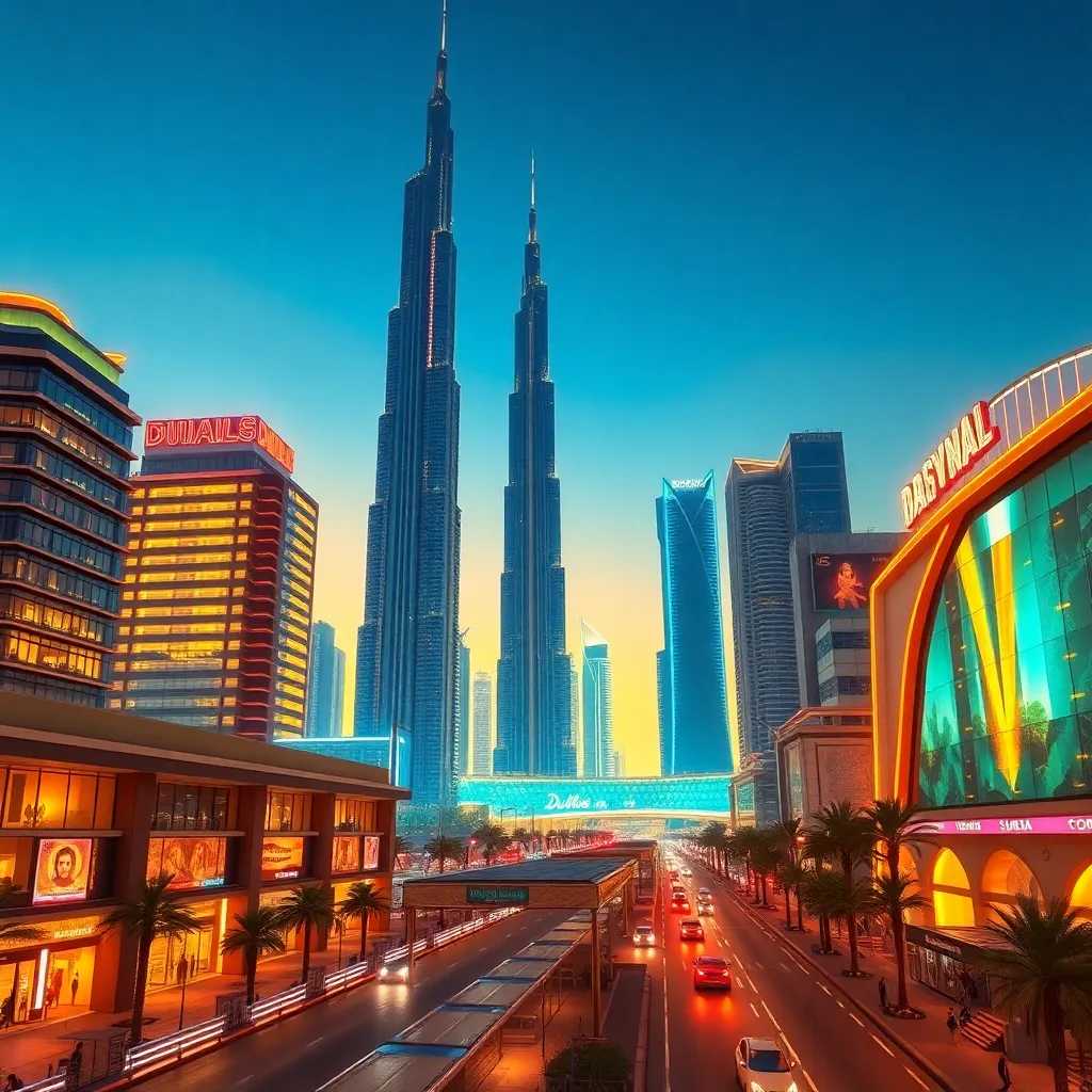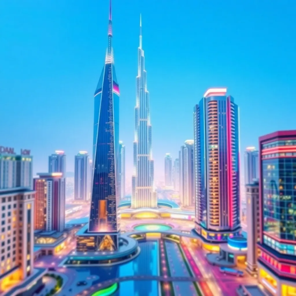 Create an AI-generated image of a futuristic skyscraper in Dubai's Downtown area, with a sleek, modern design and vibrant colors. Incorporate iconic landmarks like the Burj Khalifa and Dubai Mall, with a subtle blend of traditional and contemporary architectural elements. The image should exude luxury, innovation, and futuristic appeal.