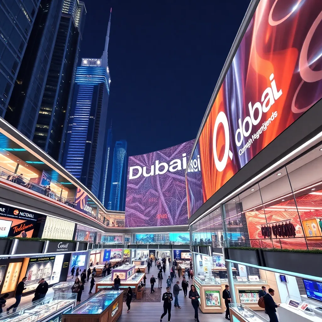 Create a futuristic image of a bustling Dubai shopping mall at night. The exterior should feature sleek skyscrapers, neon lights, and a massive LED screen displaying the city's iconic logo. Inside, showcase a vibrant marketplace with rows of gleaming jewelry and electronics stores, bustling with shoppers and sales assistants.