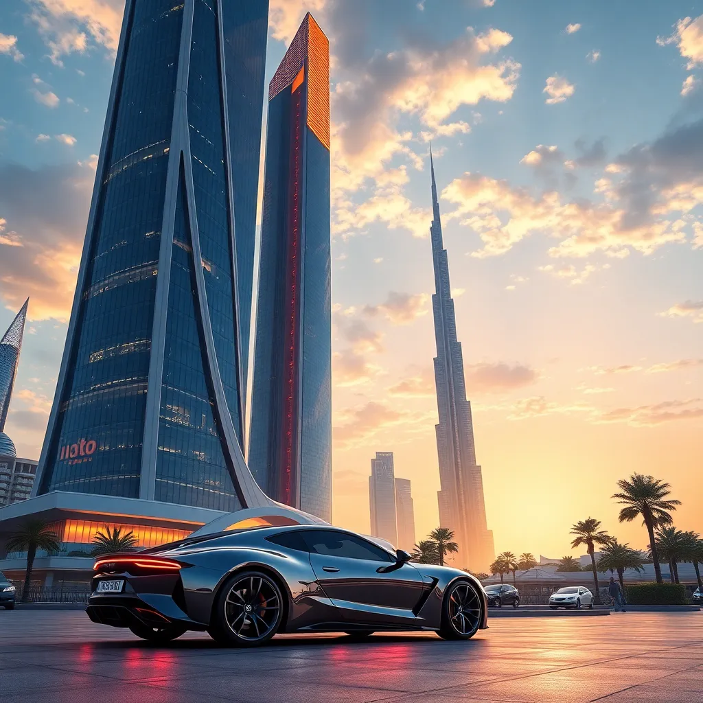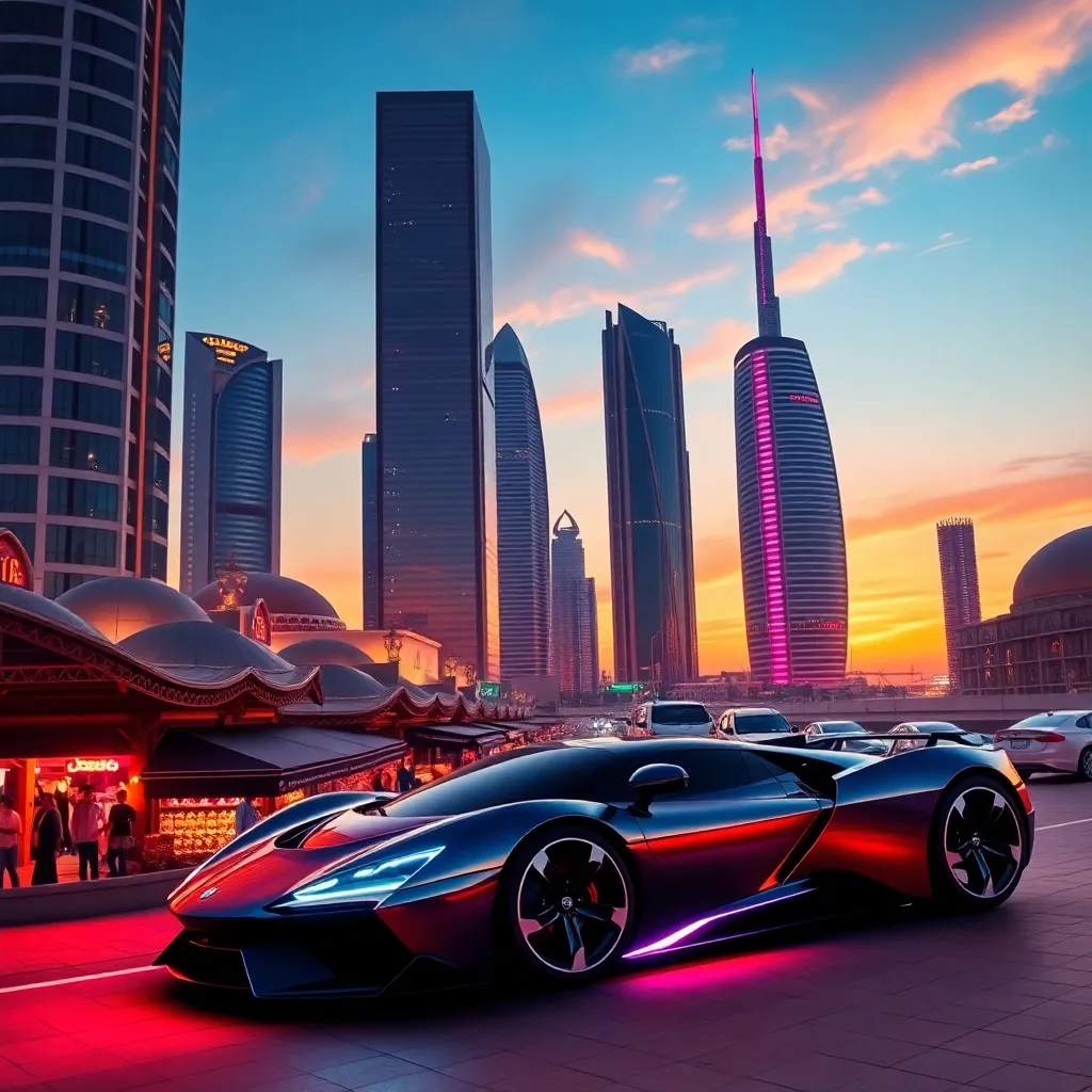 Create an AI image of a futuristic Dubai cityscape at sunset, with sleek skyscrapers, a bustling souk in the foreground, and a sleek, high-tech sports car parked outside a luxurious hotel. Incorporate vibrant colors and subtle neon lights to capture the essence of Dubai's modern and innovative spirit.