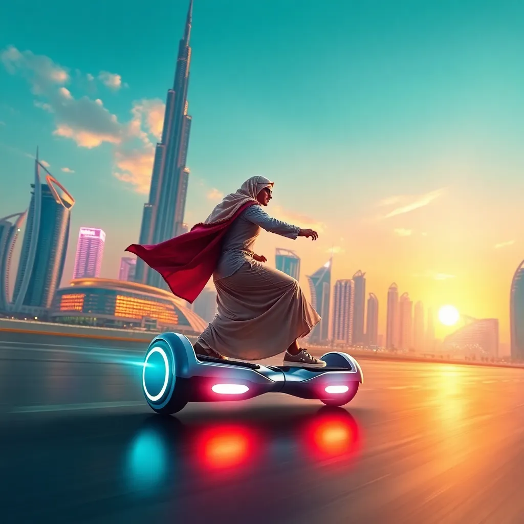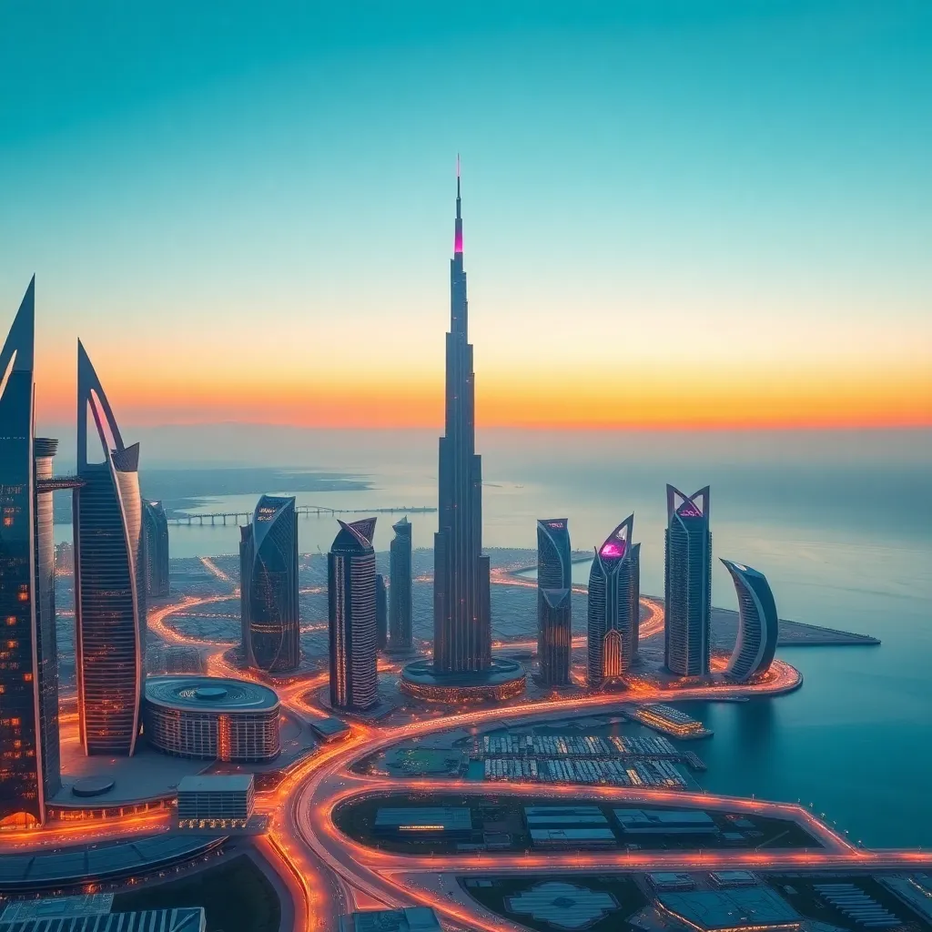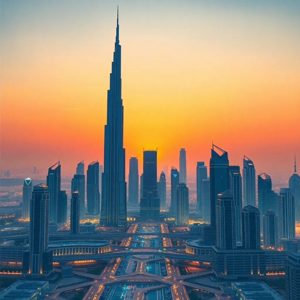 Create an eye-catching digital image showcasing the iconic Burj Khalifa in Dubai at sunset. Incorporate a futuristic cityscape with sleek skyscrapers, a vibrant skyline, and a hint of Arabic architecture. The image should evoke a sense of innovation, luxury, and adventure, perfect for an e-commerce brand promoting cutting-edge technology.