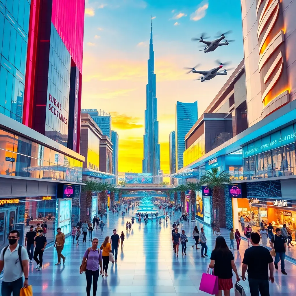 Create an eye-catching AI image of a futuristic Dubai shopping mall at sunset. Incorporate iconic landmarks like the Burj Khalifa and Dubai Fountain. Show a bustling street scene with people of diverse cultures and ages, surrounded by sleek skyscrapers and vibrant neon lights. Incorporate e-commerce elements like online shopping bags and delivery drones.