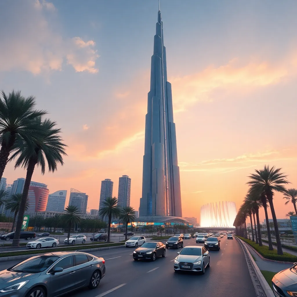 Create an AI-generated image of a futuristic skyscraper in Dubai, with a sleek and modern design, surrounded by a bustling cityscape with sleek cars and towering palm trees. Incorporate the iconic Burj Khalifa in the background, with a vibrant sunset and a subtle hint of the Dubai Fountain's water show.