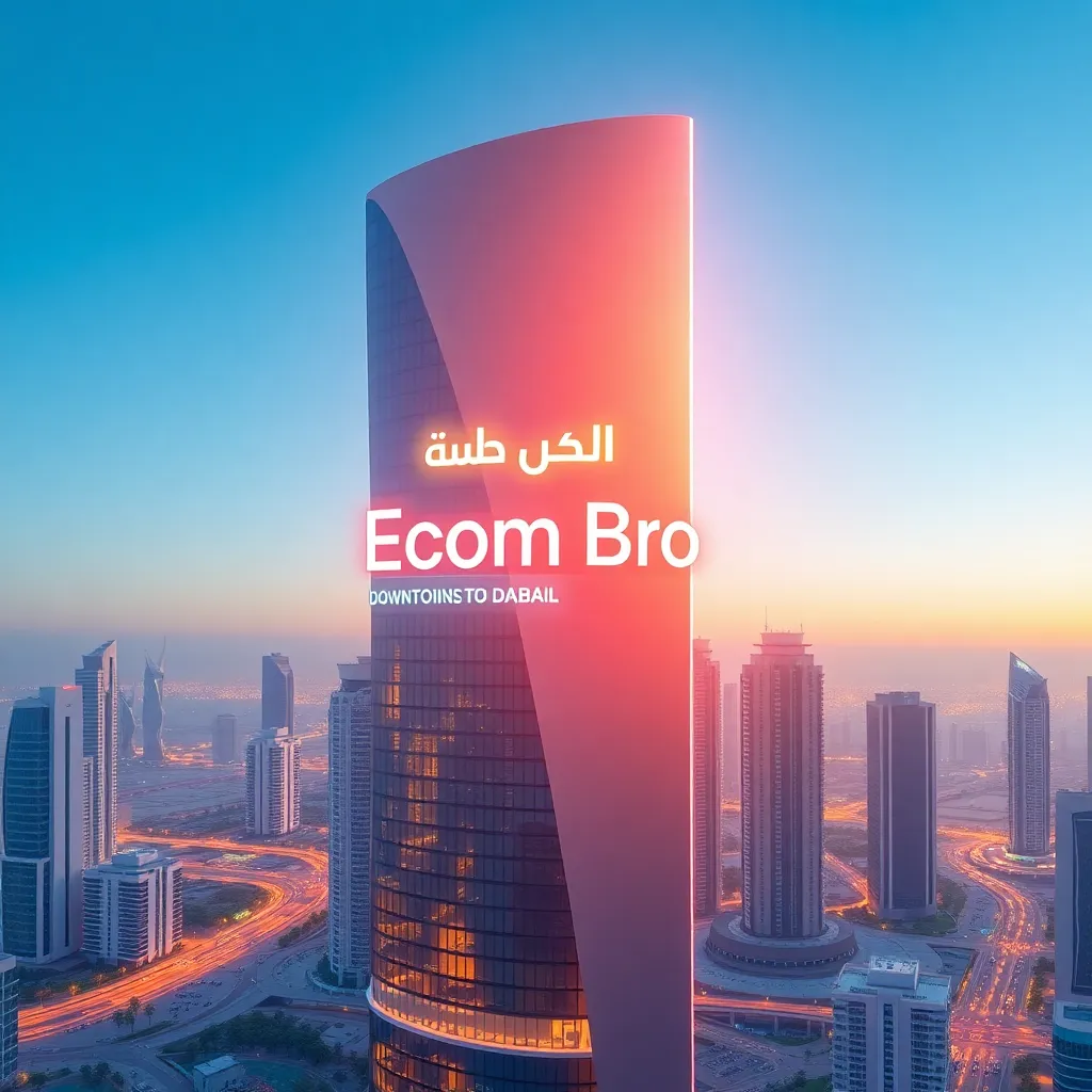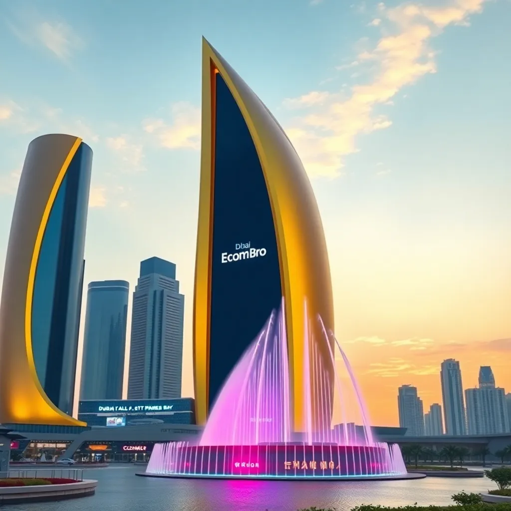 Create an AI-generated image of a futuristic skyscraper in Dubai's Business Bay, with sleek, curved lines and a shimmering gold exterior. Incorporate a giant LED screen displaying the Dubai Ecom Bro logo, with a majestic sail-shaped fountain in the foreground and a cityscape at sunset in the background.