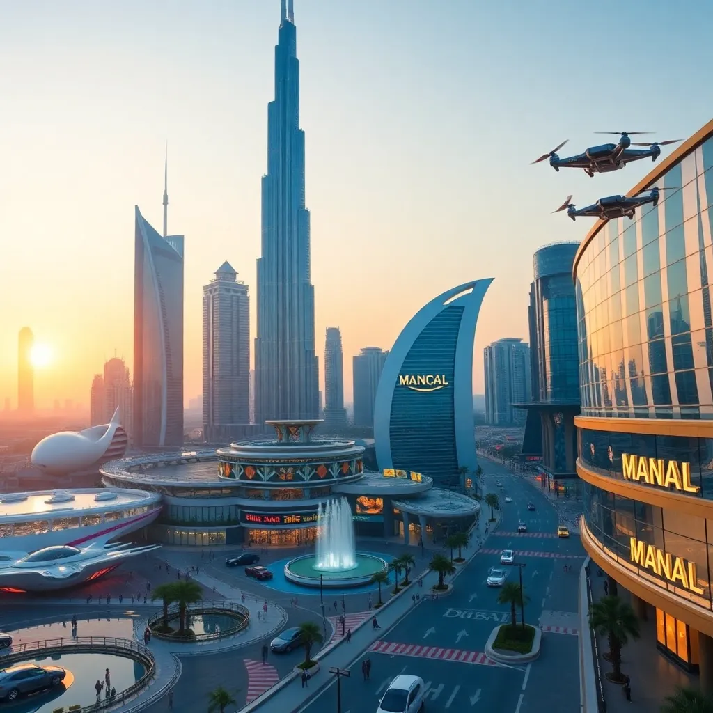 Create an image of a futuristic Dubai mall at sunset, with sleek skyscrapers, a vibrant cityscape, and a bustling streetscape. Incorporate iconic landmarks like the Burj Khalifa and Dubai Fountain. Add a few futuristic cars and drones flying by, with a subtle golden glow to represent the city's luxury and opulence.