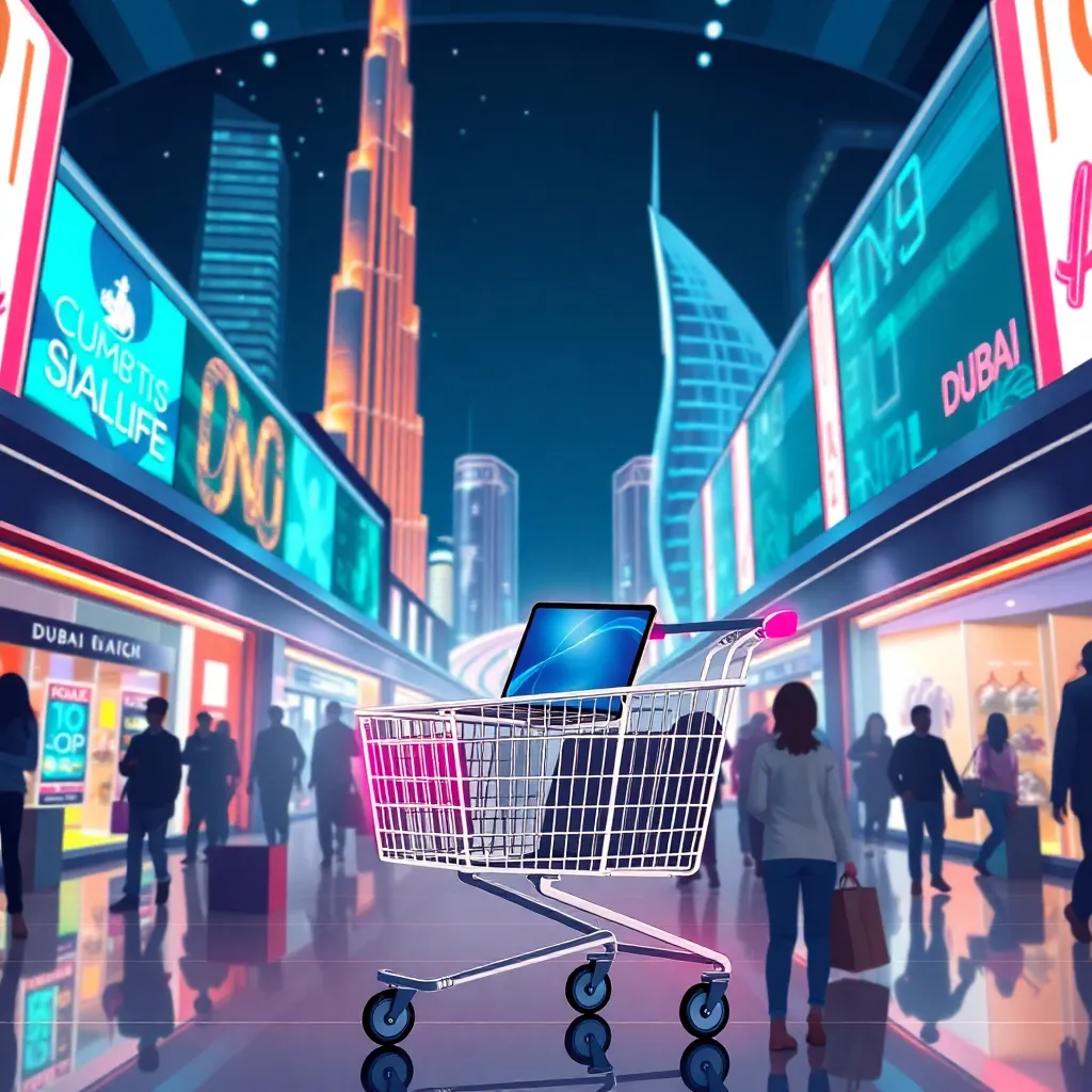 Create a futuristic illustration of a bustling Dubai mall at night. Incorporate iconic landmarks like the Burj Khalifa and Dubai Fountain. Include a sleek, high-tech shopping cart with a laptop and smartphone on it, surrounded by holographic displays and virtual try-on mirrors. Use vibrant colors and neon lights to capture the city's energy.