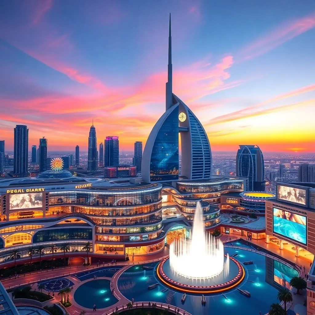 Create a futuristic AI-generated image of the Dubai Mall at night, showcasing its iconic architecture and vibrant cityscape. Incorporate sleek skyscrapers, neon lights, and a stunning sunset in the background. Highlight the mall's unique features, such as the Dubai Fountain and the massive screen displays. Make it a breathtaking visual masterpiece!