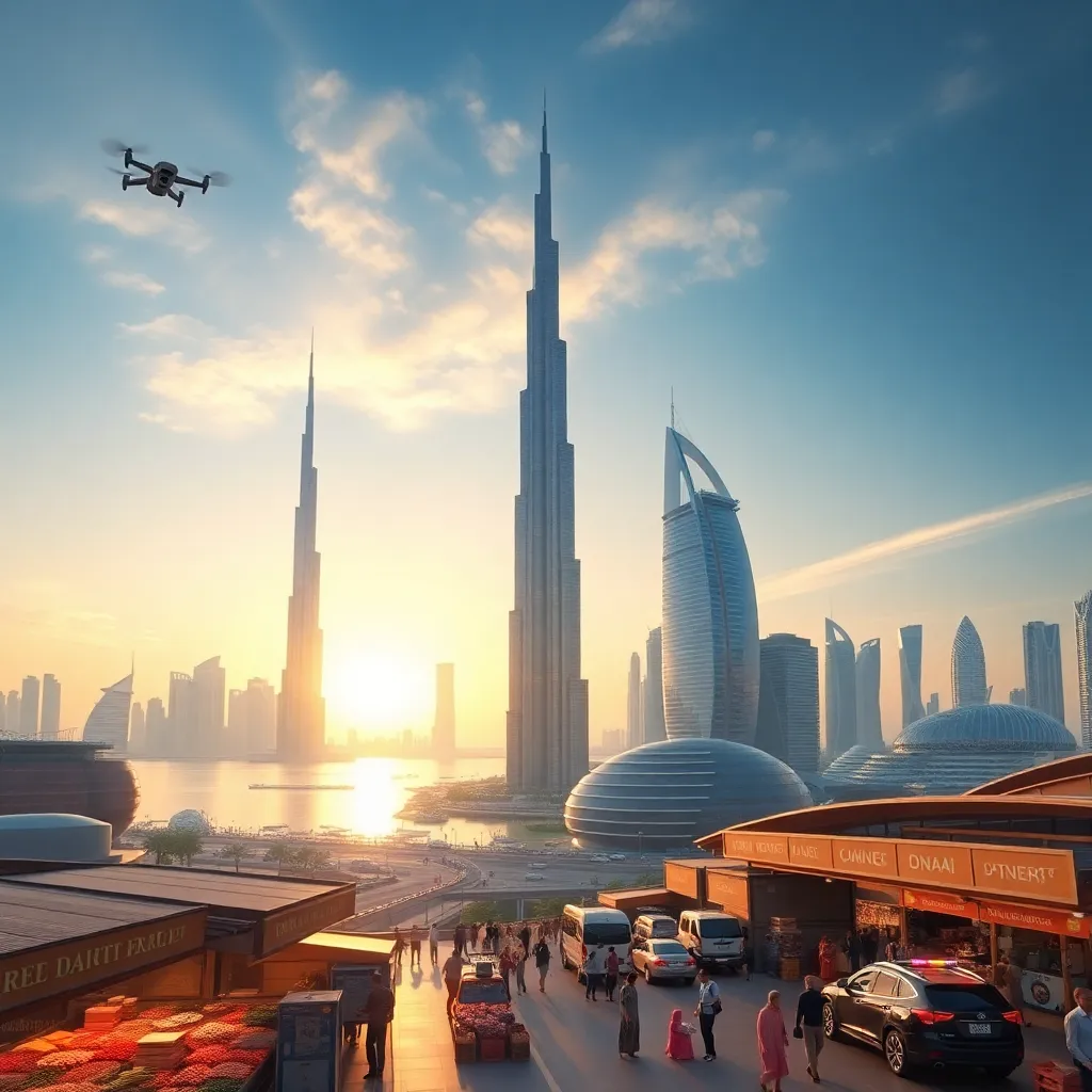 Create an AI-generated image of a futuristic Dubai cityscape at sunset, with sleek skyscrapers, a serene Arabian Gulf, and a vibrant market scene in the foreground. Incorporate iconic landmarks like the Burj Khalifa and Dubai Mall, with a touch of futuristic elements like drones and self-driving cars.