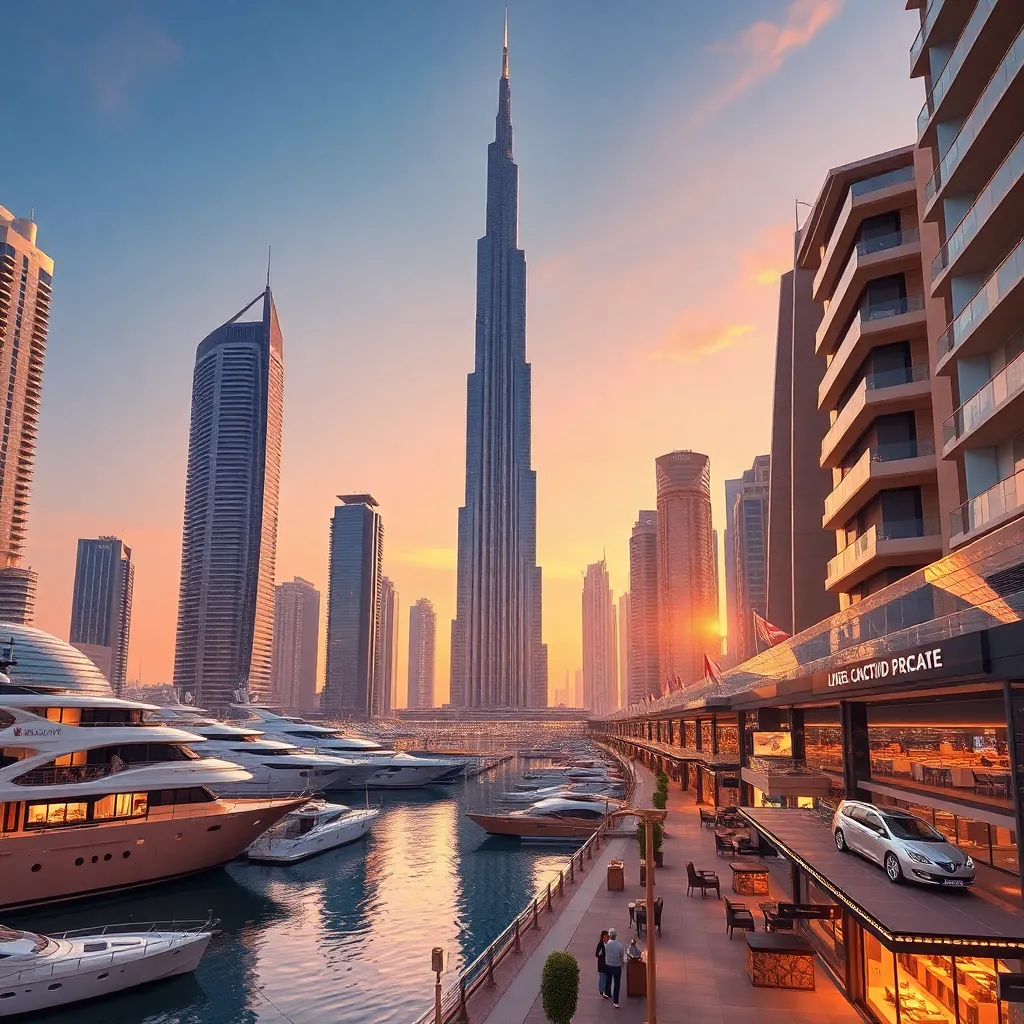 Create an AI-generated image of a futuristic Dubai cityscape at sunset, with the Burj Khalifa tower shining bright in the center, surrounded by sleek skyscrapers, luxurious yachts docked in the marina, and a bustling street lined with high-end boutiques and restaurants, all bathed in a warm, golden light.
