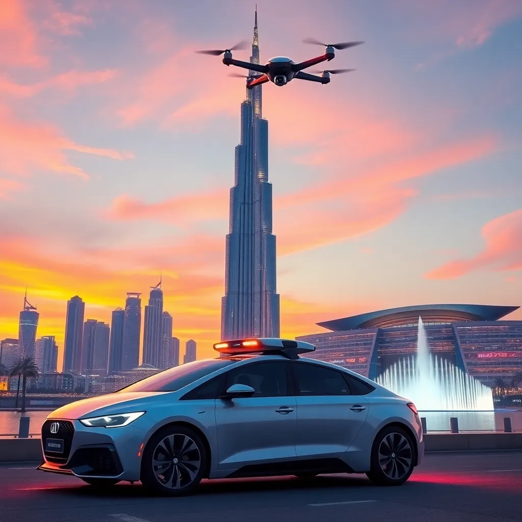 Imagine a futuristic Dubai cityscape at sunset, with the iconic Burj Khalifa skyscraper glowing bright against a vibrant orange and pink sky. A sleek, high-tech self-driving taxi is parked in front of the building, with a futuristic drone hovering above, and the Dubai Mall's majestic fountain show in the distance.