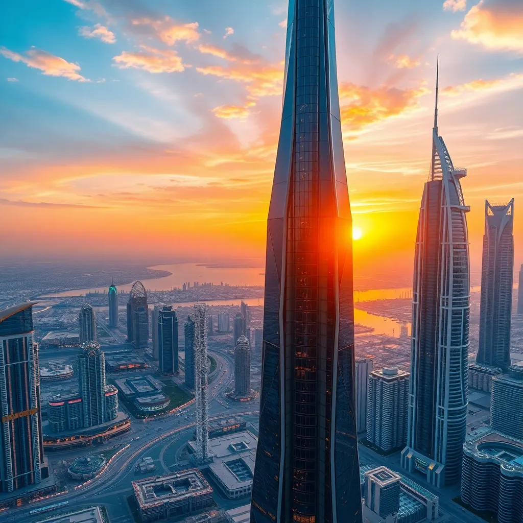 Create a futuristic and luxurious AI-generated image of a sleek, high-tech Dubai skyscraper with a breathtaking cityscape view at sunset. Incorporate vibrant colors, intricate architecture, and a sense of innovation and progress. The image should evoke feelings of wonder, excitement, and awe, showcasing the city's iconic blend of tradition and modernity.