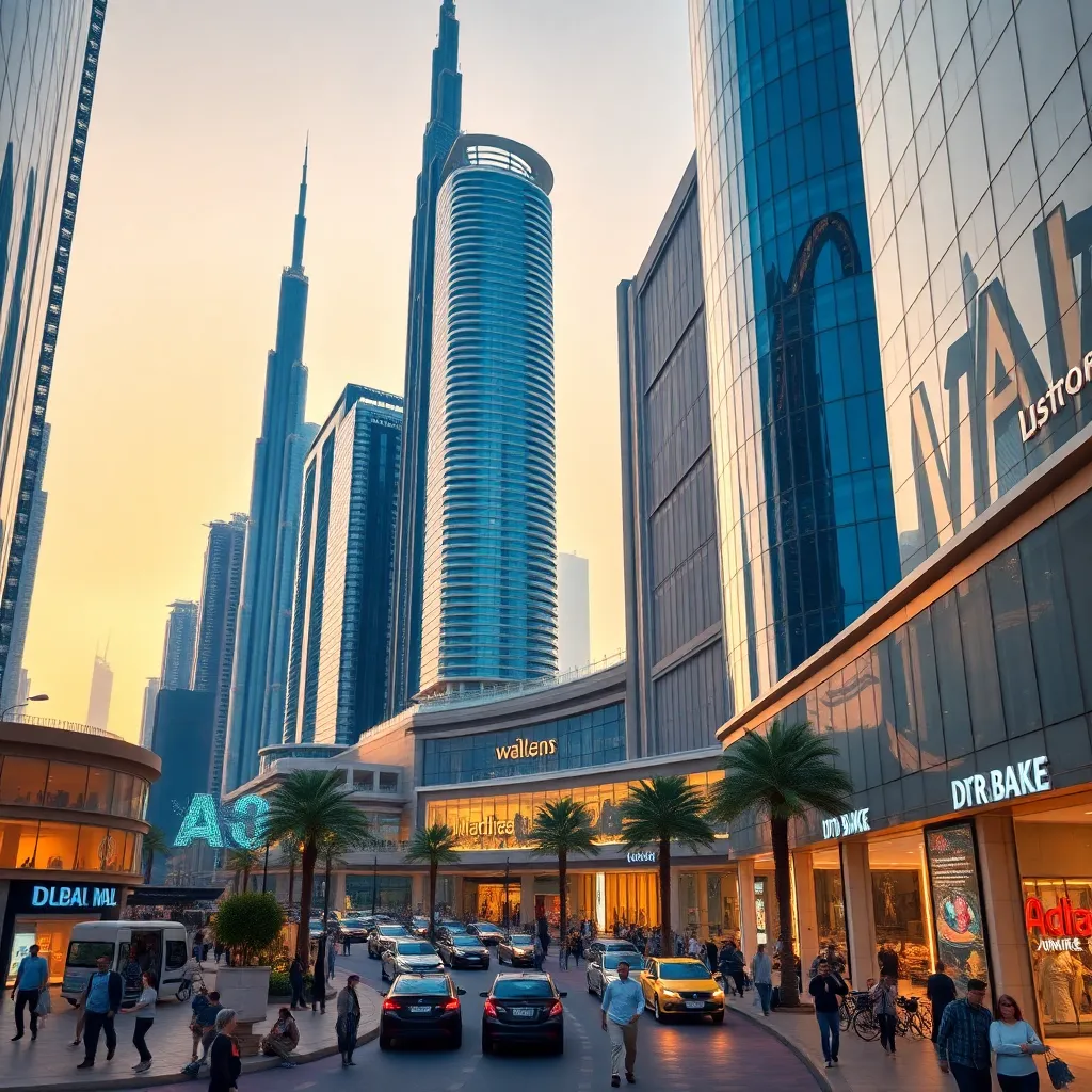 Create an AI-generated image of a futuristic Dubai shopping mall at sunset, with sleek skyscrapers, gleaming glass towers, and a vibrant street scene filled with shoppers, cars, and street performers. Incorporate iconic landmarks like the Burj Khalifa and Dubai Mall. Use a warm, golden light to capture the city's essence.