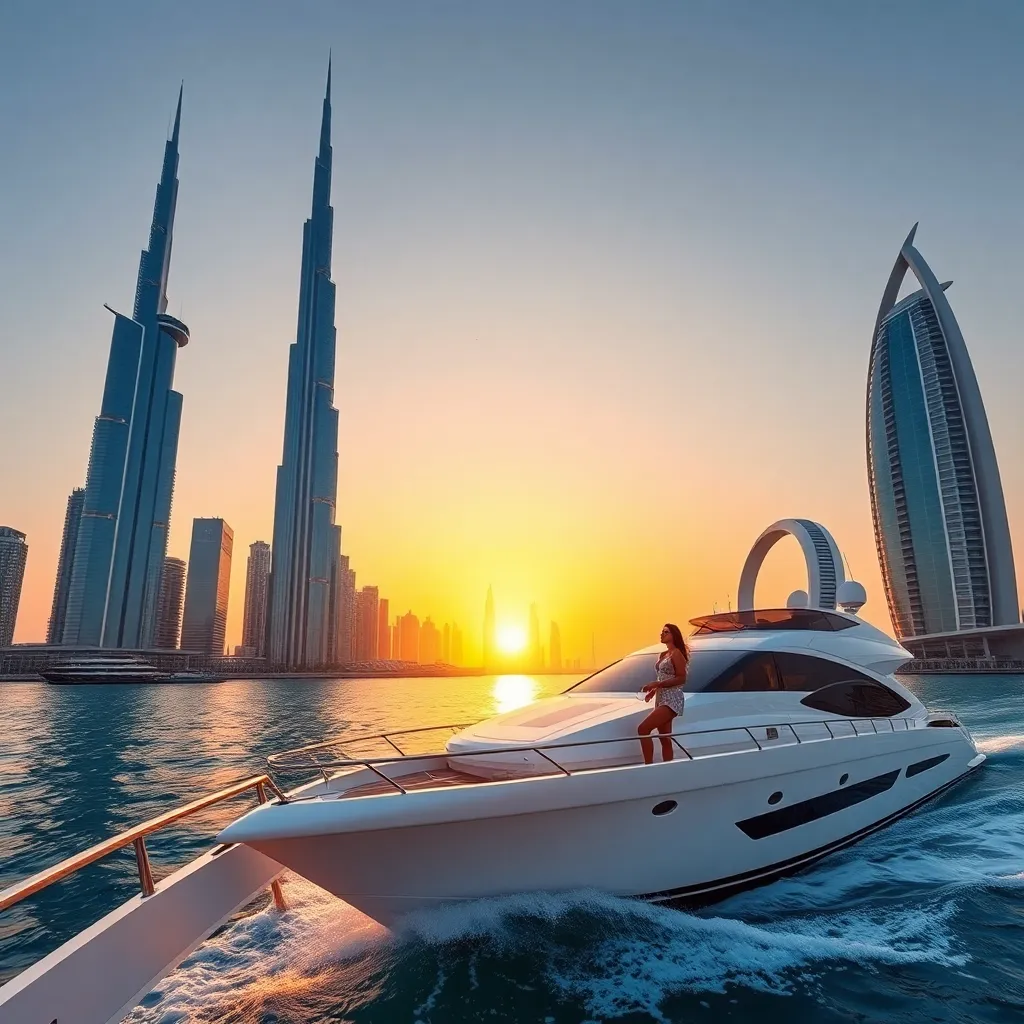Imagine a futuristic Dubai skyline with sleek skyscrapers and a majestic Burj Khalifa. Capture a stunning sunset moment with a luxury yacht sailing through the Dubai Marina, surrounded by iconic landmarks like the Dubai Frame and Palm Jumeirah. Add a touch of glamour with a stylish influencer posing on the deck.